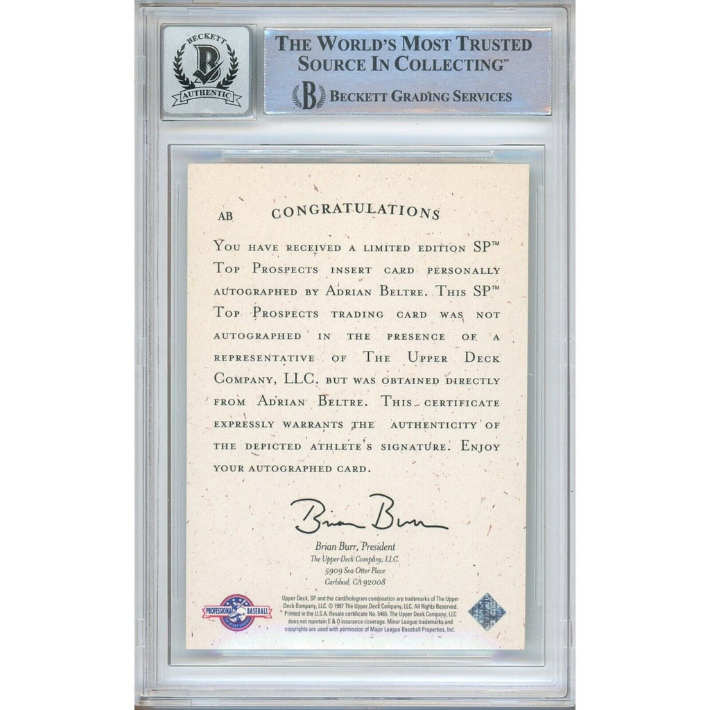Offered here is an authentic Adrian Beltre autographed trading card featuring Top Prospects Autographs from 1998. The autograph is verified by Beckett Grading Services (BGS) (Cert #00016501536).