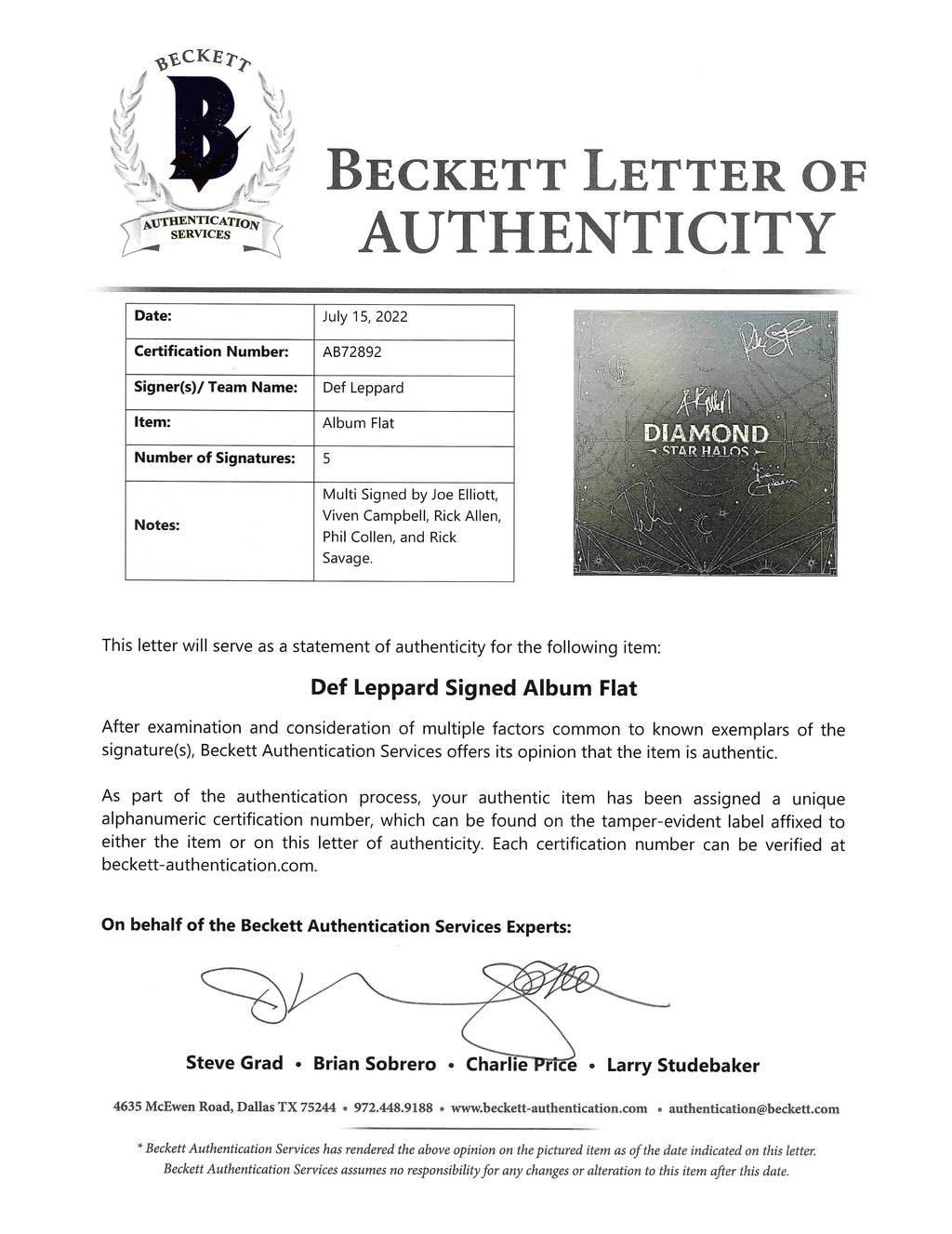 This Def Leppard vinyl record album includes a new, signed 'Diamond Star Halos' 12x12 inch flat and a new, unplayed copy of Def Leppard's Diamond Star Halos vinyl record album. The flat, autographed by Joe Elliott, Vivian Campbell, Rick Allen, Phil Collen, and Rick Savage in silver or gold paint pen, has been thoroughly examined and certified authentic by Beckett Authentication Services (BAS). For verification, visit www.Beckett-Authentication.com and enter the authentication number AB72892. Don't forget to click on the images for a closer look and explore our website for additional Hollywood and celebrity autographs.