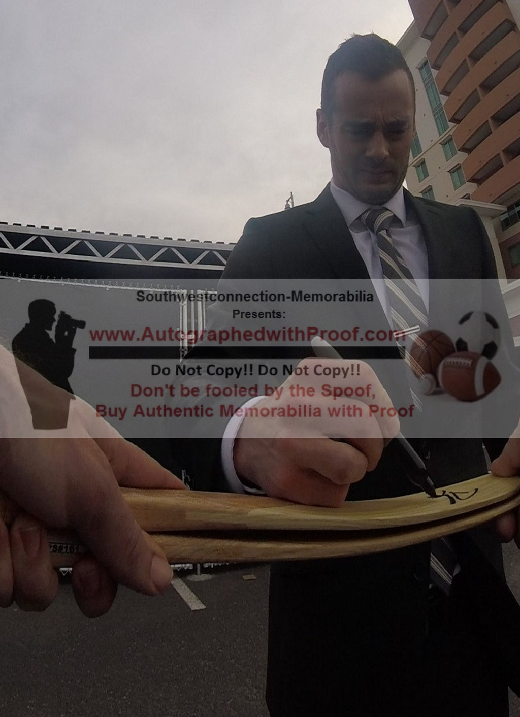 This custom Calgary Flames logo hockey stick blade is autographed by Derek Ryan himself. Sporting a sleek black sharpie signature, this hockey stick blade comes with a proof photo, personally signed by Derek Ryan. Rest assured, an expert from Beckett Authentication Services (BAS) has examined and certified this item as authentic. Verify its authenticity by entering the authentication number "S38311" at www.Beckett-Authentication.com. For more NHL and Olympics autographed collectibles, be sure to browse our website.