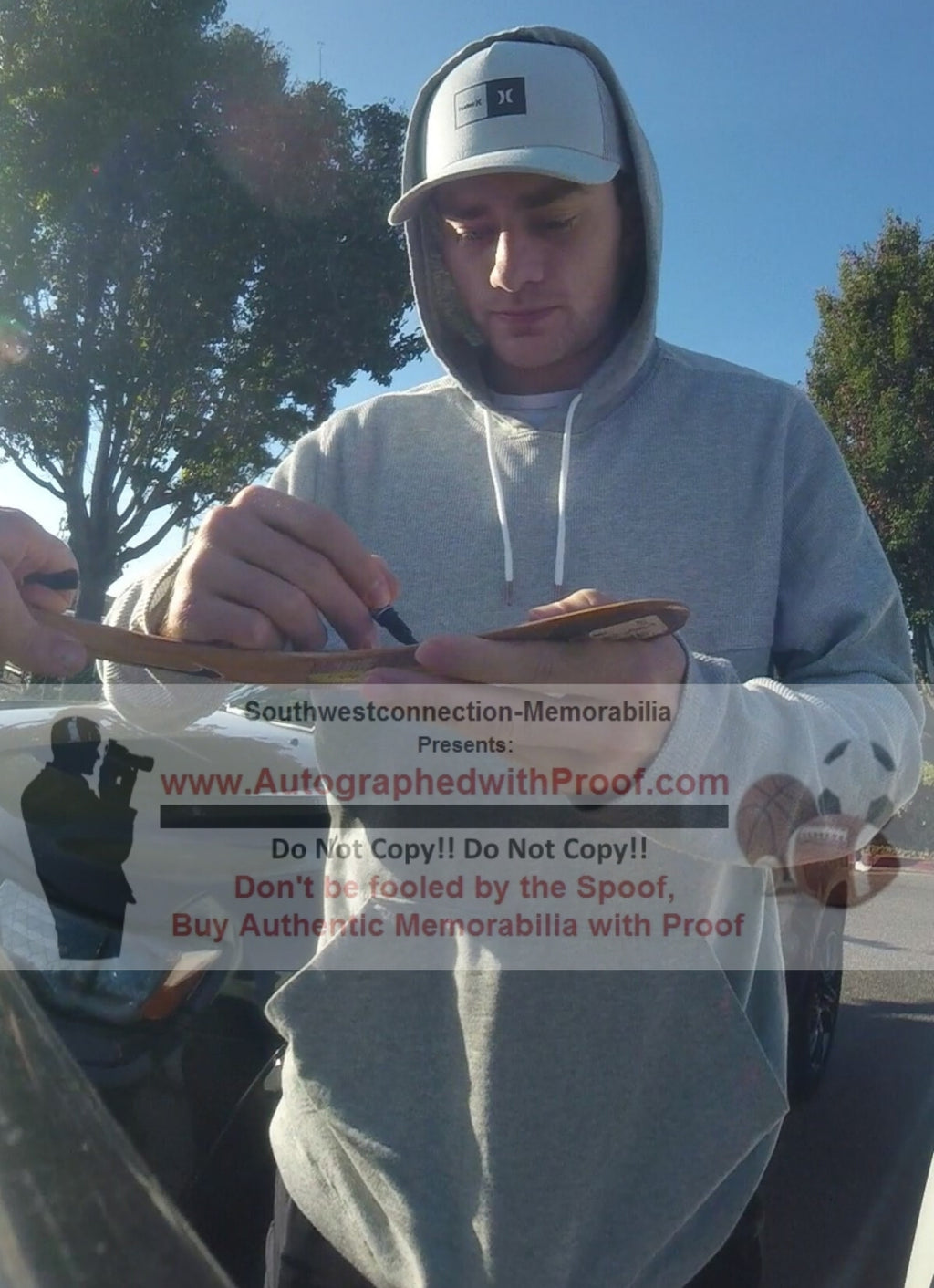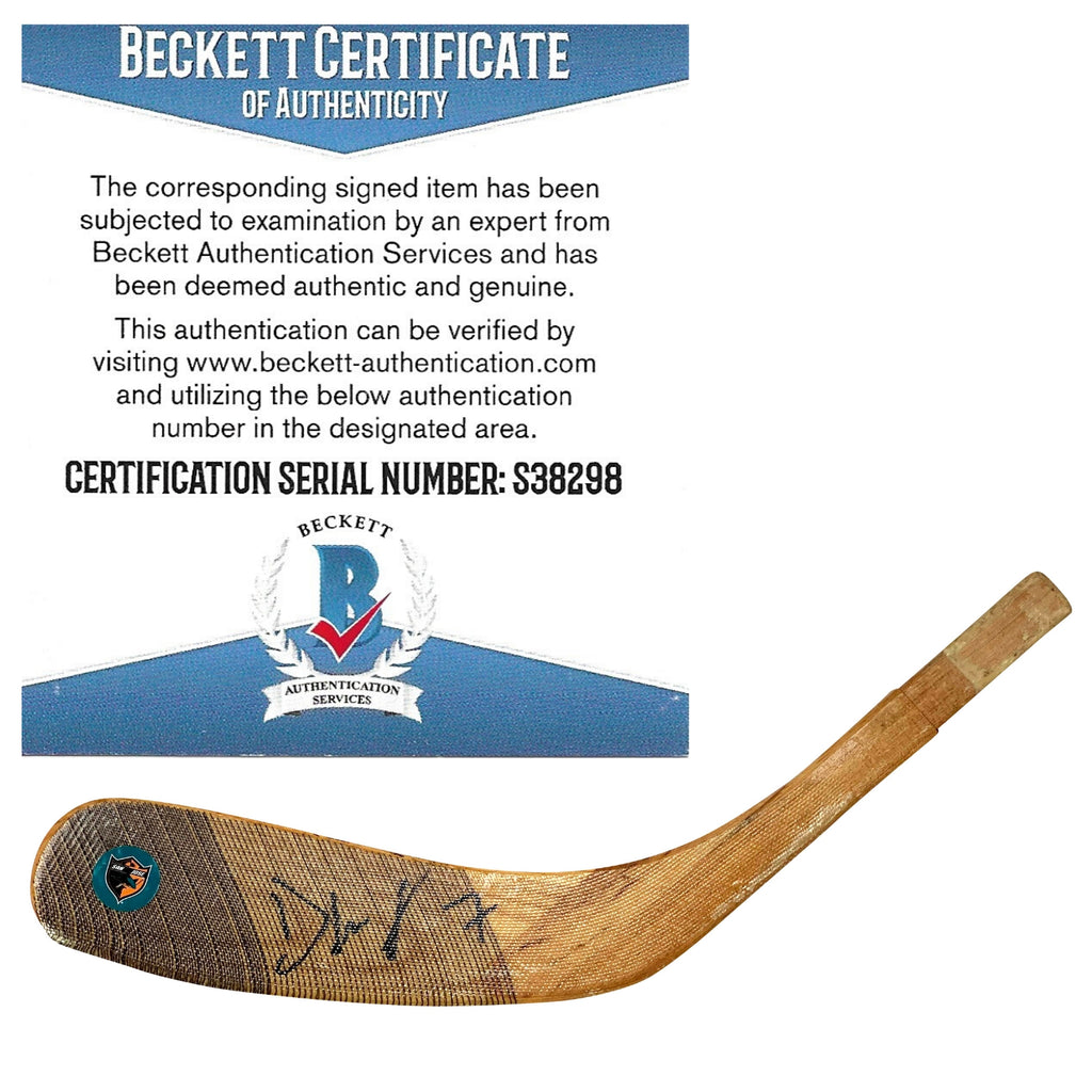 This custom San Jose Sharks logo hockey stick blade has been personally autographed by Dylan Gambrell in black sharpie. A proof photo of Gambrell signing this exact stick blade is included free with purchase. It has been thoroughly examined and certified as authentic by an expert from Beckett Authentication Services (BAS). To verify its authenticity, visit www.Beckett-Authentication.com and enter the authentication number S38298. Please click on images to enlarge and browse our website for more signed NHL and Olympics collectibles.