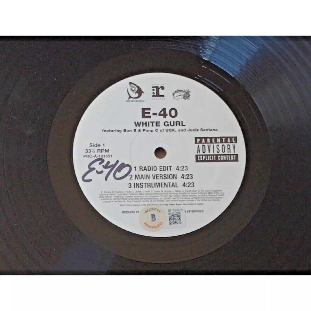 This is an E-40 autographed 12-inch single vinyl record album for the song "White Gurl" and "Just Fkn". E40 signed the album in black sharpie, with the signature having been examined and certified as authentic by an expert from Beckett Authentication Services (BAS). It can be verified on www.Beckett-Authentication.com using the authentication number BF16905. Please note that as of May 2022, BAS will no longer issue Certificate of Authenticity cards. Instead, scan the QR code on the certification sticker to confirm authenticity and pertinent information through the Beckett Authentication Database. The charge for this authentication will begin with the certificate number sequence BF. Please click on images to enlarge and browse our website for more autographed collectibles from Hollywood and the world of Rap and Hip-Hop music.