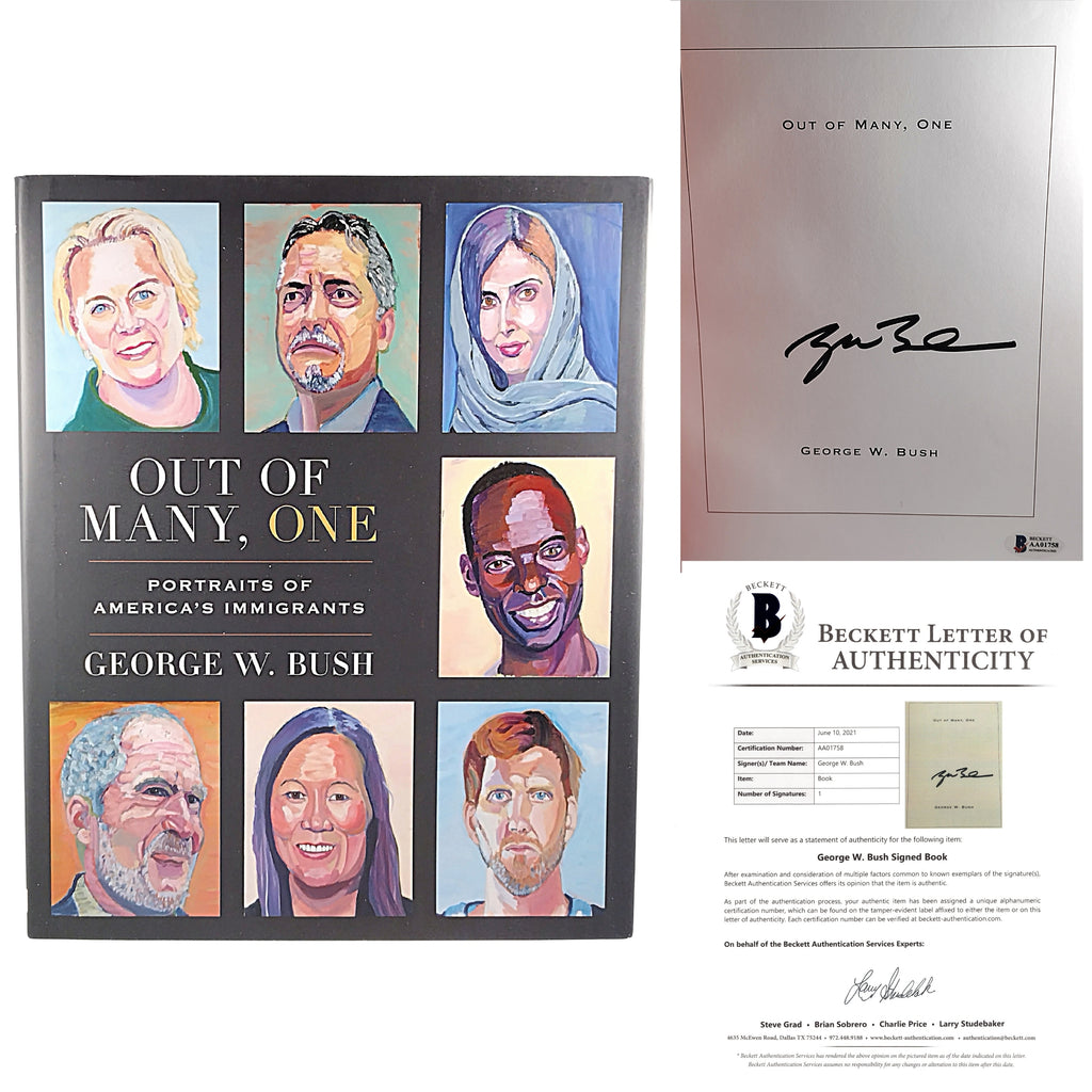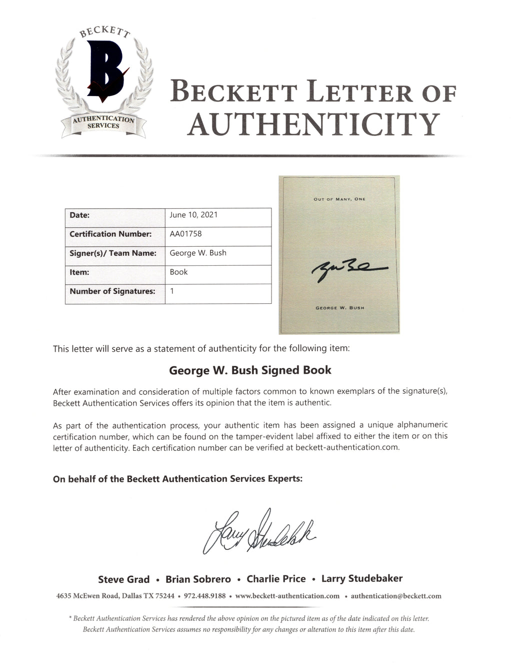 This is a first edition hardcover book of "Out of Many, One," autographed by former President George W. Bush. His signature, in black sharpie, has been verified and deemed authentic by an expert from Beckett Authentication Services (BAS). You can verify this certification by visiting www.Beckett-Authentication.com and entering the authentication number AA01758. For more Hollywood and music autographed collectibles, please browse our website.
