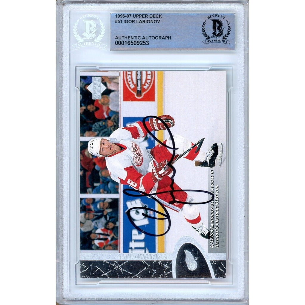 Offered here is an authentic Igor Larionov signed trading card featuring Upper Deck from 1996-97. The autograph is verified by Beckett Authentication Services (BAS) (Cert #00016509253).