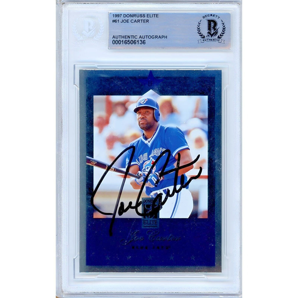Offered here is an authentic Joe Carter signed trading card featuring Donruss Elite Baseball from 1997. The autograph is verified by Beckett Authentication Services (BAS) (Cert #00016506136).