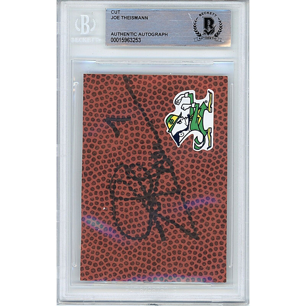 This Notre Dame Fighting Irish football cut is an authentic autograph by Joe Theismann. Beckett Authentication Services (BAS) has verified the signature with certificate number 00015963253 and encapsulated it for protection. As a former quarterback for the Washington Redskins, Theismann's autograph is a valuable addition to any sports memorabilia collection. Encapsulation and authentication features add even more value to this item, with the black Sharpie signature measuring 3.25" x 5". This guarantees the buyer a genuine and authenticated product.