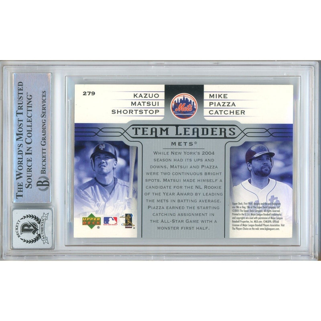 This sought-after Kazuo Matsui autographed baseball card is an essential for both New York Mets enthusiasts and collectors. Featuring an encapsulated, genuine autograph in hard ink, authenticated by Beckett Authentication Services (BAS) and graded a 10. Also boasting high-quality card stock, a unique number (279), and Hall of Famer Mike Piazza, this original 2005 season card is professionally displayed in a Beckett slab. With the added bonus of Matsui's blue Sharpie signature, this autographed New York Mets 2005 Upper Deck 'Team Leaders' card (#279) has been certified and encapsulated by experts at BAS, with certificate number 00016499607 and graded by Beckett Grading Services (BGS) as a 'Auto 10' grade.