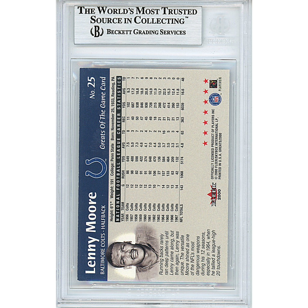 Offered here is an authentic Lenny Moore signed trading card featuring Fleer Greats of the Game from 2000. The autograph is verified by Beckett Grading Services (BGS) (Cert #00013190658).
