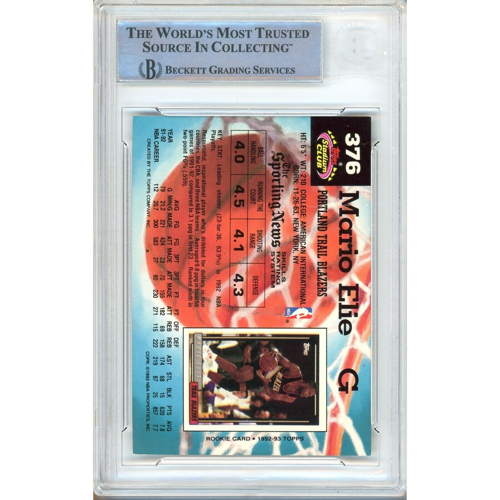 This Mario Elie autographed basketball card from the 1992-93 Stadium Club set is a valuable addition for Portland Trail Blazers fans. It has been certified and authenticated by Beckett Authentication Services (BAS), with a unique certification number of 00016504304. The signature is hard-signed and on-card, adding to its uniqueness and authenticity. The card also comes encapsulated in a BAS slab, ensuring its preservation for many years to come. Additionally, it features a basketball and NBA autograph, and is part of the base set. This card is a great way to commemorate Elie's time with the Trail Blazers and is a must-have for any collection. Autographed in Black Sharpie. Mario Elie Autographed Portland Trail Blazers 1992-1993 Topps Stadium Club Basketball Card #376. This signature is authenticated and encapsulated by Beckett Authentication Services (BAS), with the certificate number 00016504304.
