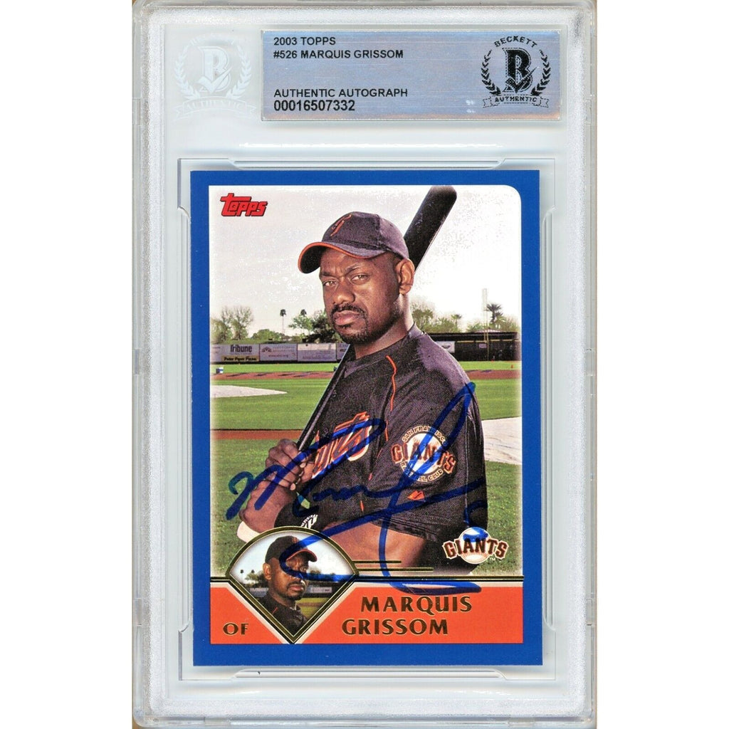 This 2003 Topps baseball card boasts a highly coveted autograph from Marquis Grissom, a well-known player for the Cleveland Indians (Guardians), San Francisco Giants, Montreal Expos, Atlanta Braves, and Milwaukee Brewers. Crafted with premium card stock material, the card has been officially authenticated by Beckett Authentication Services (BAS) with an authentication number of 00016506269. It is an essential addition to any baseball enthusiast or collector's repertoire, especially for those who admire the accomplishments of Marquis Grissom. This original, hard-signed autograph on card stock material is encapsulated in a Beckett slab, elevating its value in any collection. Don't miss out on the chance to own this rare piece of baseball history. Signed in Blue Sharpie. Marquis Grissom's autographed San Francisco Giants 2003 Topps Baseball Card #526 has also been certified and encapsulated by the experts at Beckett Authentication Services (BAS).