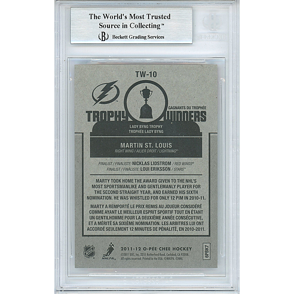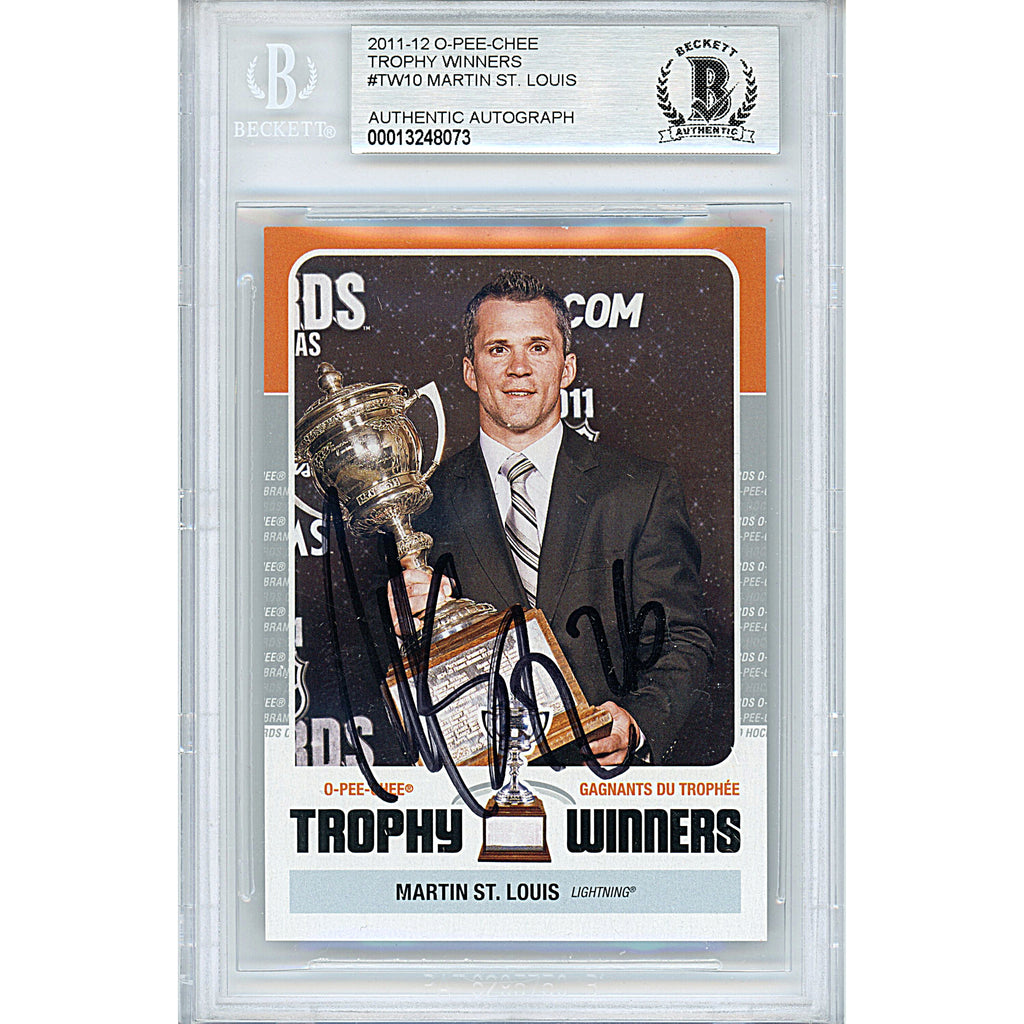 This Martin St Louis Signed Tampa Bay Lightning 2011-12 O-Pee-Chee Hockey Card has been professionally authenticated by Beckett Authentication Services. The autograph, in black sharpie, is certified as genuine and comes with a tamper-proof card protector. To verify the authenticity, go to www.Beckett-Authentication.com and enter the designated number 00013248073. For more details, click on the images or browse our collection of NHL and hockey autographed memorabilia. St. Louis has an impressive list of career achievements, including being a Stanley Cup champion, 6-time NHL All Star, 2-time Art Ross Trophy winner, Hart Memorial Trophy recipient, and Winter Olympic Gold Medalist. He has played for the Tampa Bay Lightning, Calgary Flames, and New York Rangers, and currently serves as the head coach for the Montreal Canadiens.