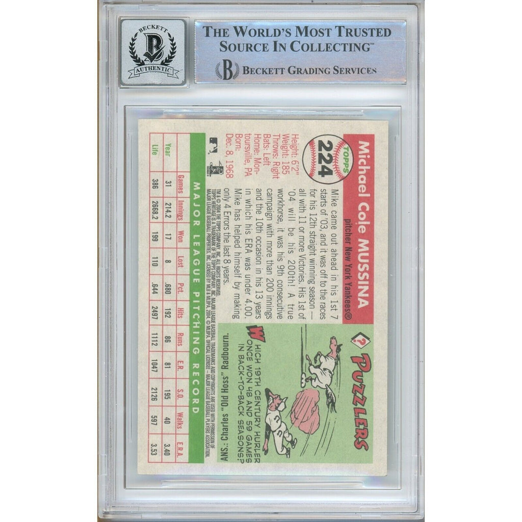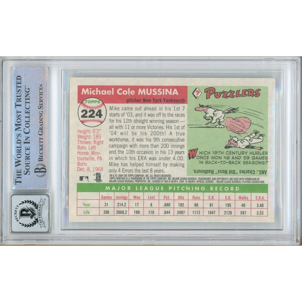 This autographed Mike Mussina card from the 2004 Topps Heritage Set is a necessary addition to any collection, especially for fans of the New York Yankees or Baltimore Orioles. The card is made from high-quality card stock and features Mussina's signature in bold ink, graded as a 10 by Beckett Authentication Services. Protected in a slabbed case, this original and licensed trading card includes a BAS authentication number of 00016499600, making it a valuable addition to any sports card collection. Additionally, this standard size card, number 224, has been authenticated and encapsulated by the experts at Beckett Authentication Services and given a 'Auto 10' grade by Beckett Grading Services. Certificate Number 00016499600.