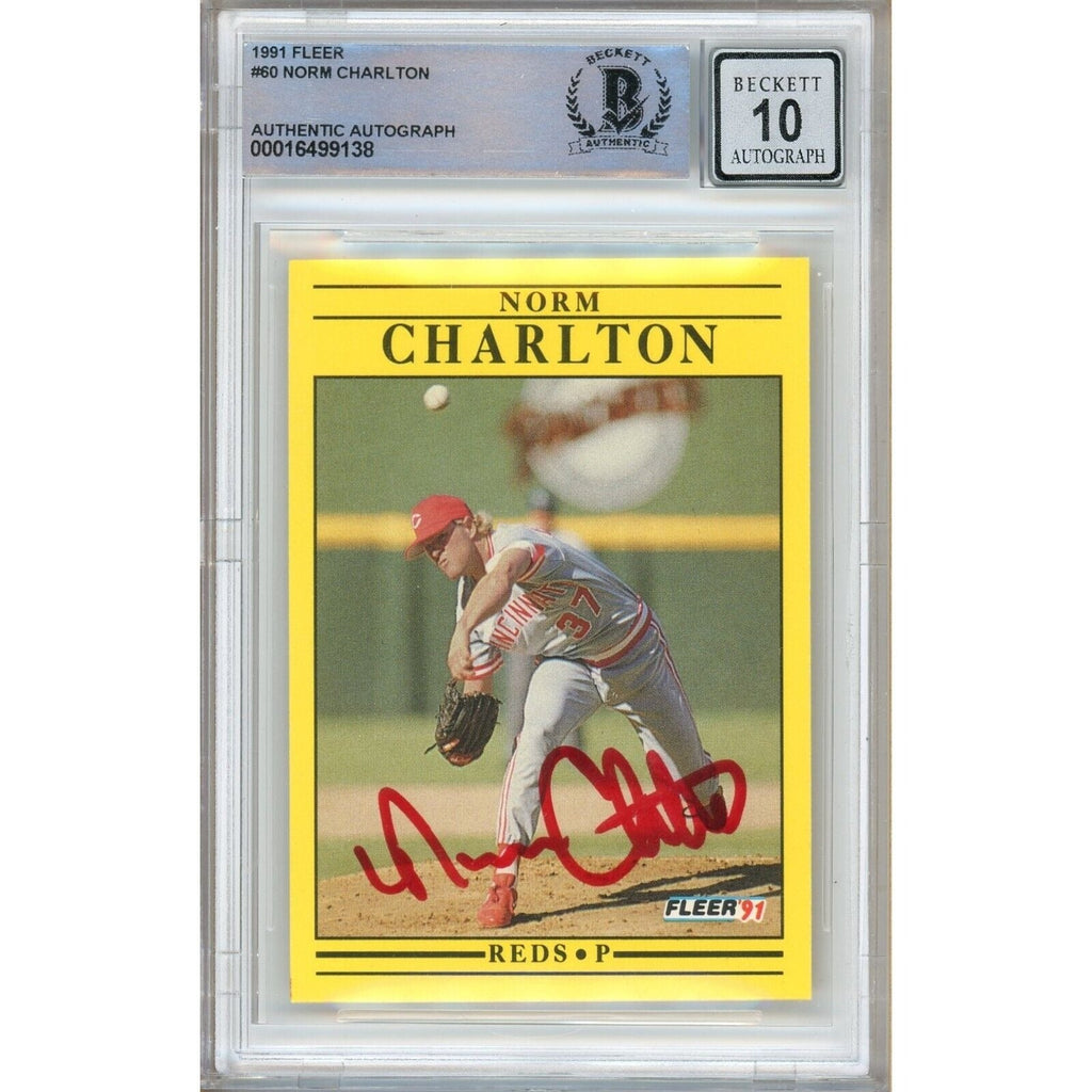 Offered here is an authentic Norm Charlton signed trading card featuring Fleer Baseball from 1991. The autograph is verified by Beckett Grading Services (BGS) (Cert #00016501938).