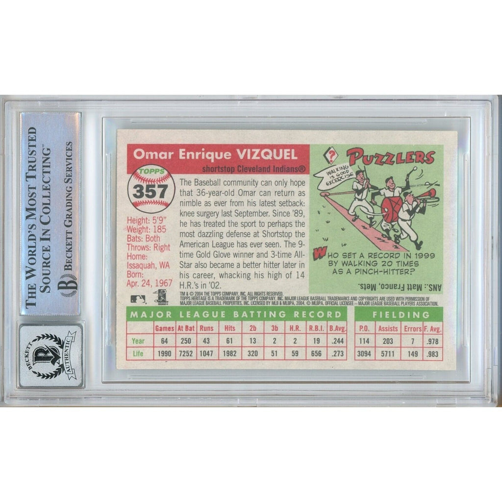 This Omar Vizquel autographed Cleveland Indians 2004 Topps Heritage baseball card is a must-have for collectors. It features a hand-signed autograph from Vizquel, making it a rare and highly sought-after item. With a BGS Auto 10 grade from Beckett Grading Services and BAS authentication, this card is of the highest quality and authenticity for fans and collectors alike. Don't miss your chance to own this unique and valuable piece of sports history, as certified by Beckett Authentication Services. Certificate Number 00016499612. This signature has been graded by the Experts at BGS, showcasing a 'Auto 10' grade.