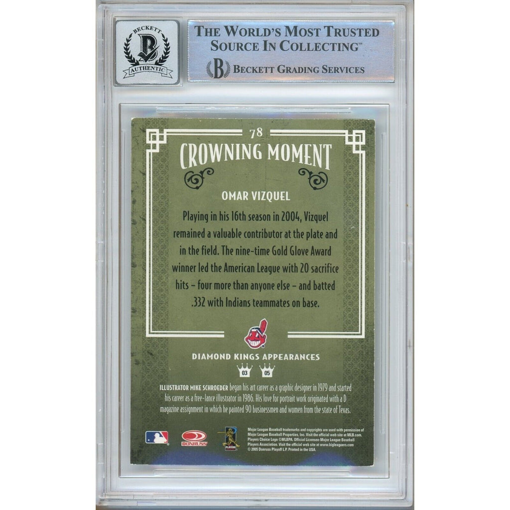 This Omar Vizquel autographed Cleveland Indians Diamond Kings card from the 2005 Donruss set is a unique collector's item. The signature, which has been authenticated by Beckett Authentication Services (BAS), has received the rare grade of Auto-10. The card showcases Vizquel in his Cleveland Indians jersey and is numbered #78. It is a standard size, made of card stock, and features an on-card auto. Encapsulated in a Beckett slab, this card has been labeled as authentic. An ideal addition for any passionate Cleveland Indians or Omar Vizquel supporter, this item is a must-have for any sports trading card collection. The signature, authenticated and encapsulated by the experts at Beckett Authentication Services (BAS), has also been graded by Beckett Grading Services (BGS) with an 'Auto 10' grade. Certificate Number 00016499610.