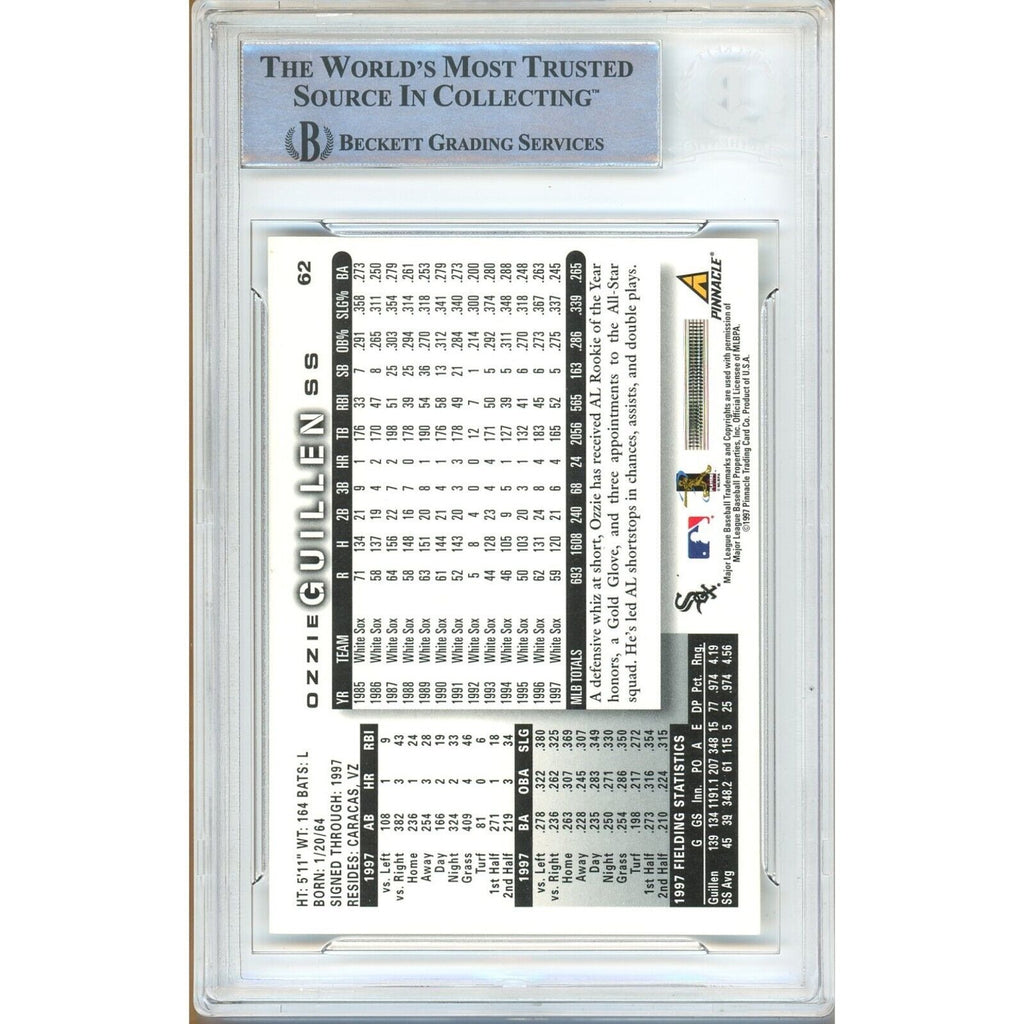 This 1998 Score baseball card features an autograph from Ozzie Guillen, a former player for the Chicago White Sox in the Major League (MLB). The card, made of card stock, is officially licensed and encapsulated for authenticity by Beckett Authentication Services (BAS). The autograph is hard-signed in black sharpie and is part of a single trading card, numbered 62. This vintage card is a must-have for collectors and fans of the Chicago White Sox, Atlanta Braves, Baltimore Orioles, and other teams. Certificate number 00016507390 confirms its authenticity.