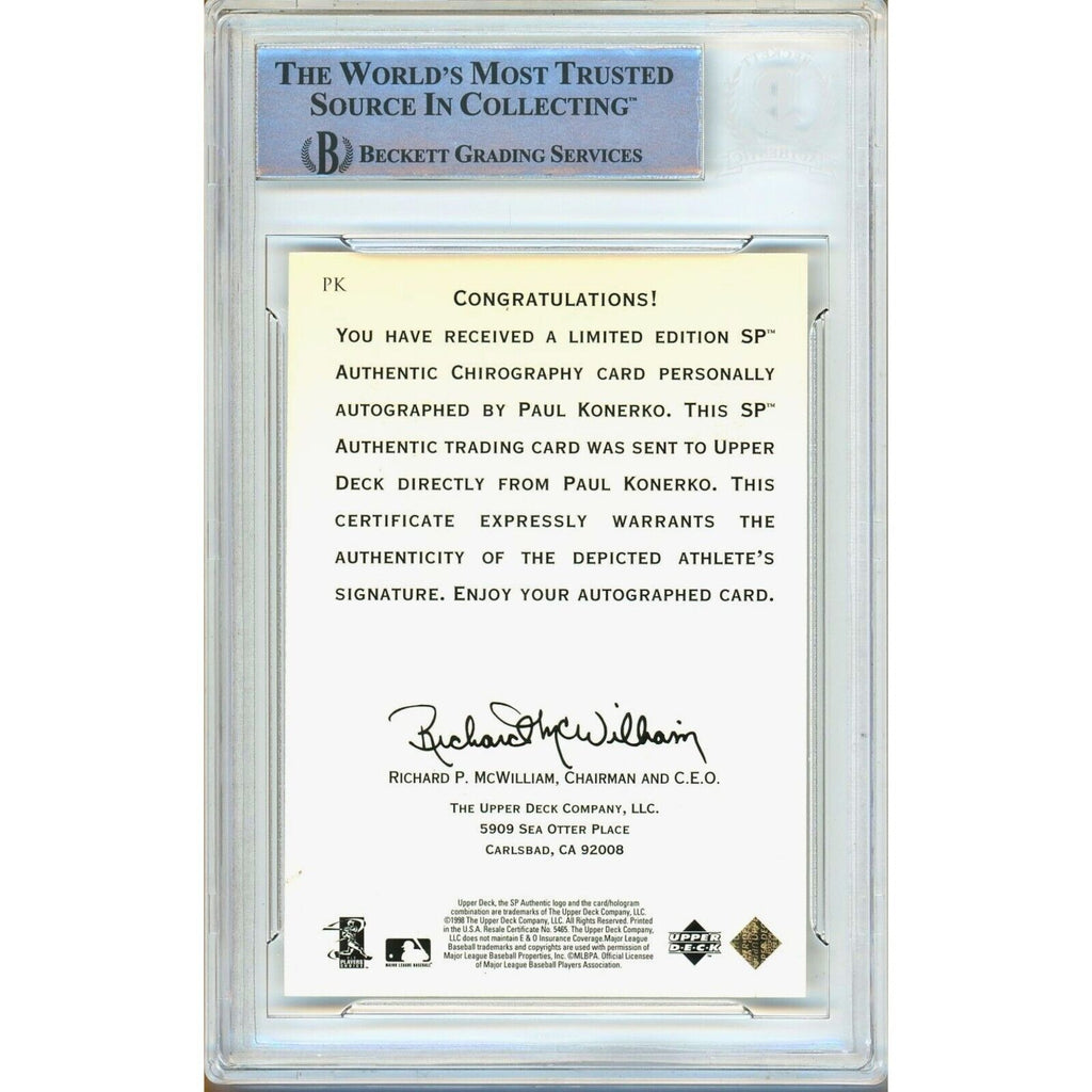 This autographed sports card features the autograph of Paul Konerko, former baseball player for the Chicago White Sox and the Los Angeles Dodgers. It is a part of the 1998 SP Authentic Chirography collection and is an officially licensed trading card produced by Upper Deck. The hard-signed autograph has been verified by Beckett Authentication Services (BAS) with an authentication number of 00016504932. Made of card stock, the card is a standard size and makes for a valuable addition to any baseball card collection, particularly for fans of the Chicago White Sox and the Los Angeles Dodgers. Konerko's signature, in Blue Sharpie, has been authenticated and encapsulated by the experts at Beckett Authentication Services (BAS) with a certificate number of 00016504932.