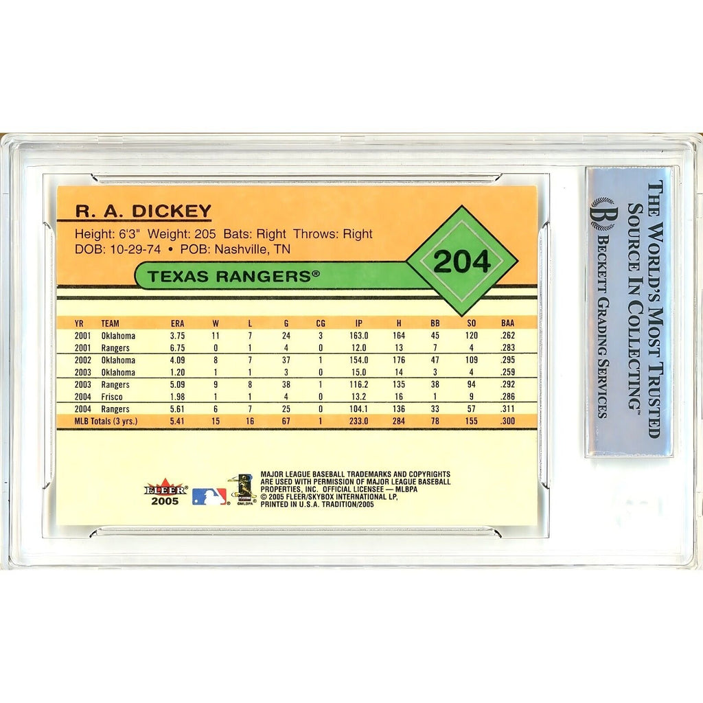 This trading card features the autograph of R.A. Dickey, a highly respected player who has played for multiple teams, including the NY Mets, Toronto Blue Jays, Texas Rangers, and others. Part of the 2005 Fleer Tradition set, this card has been officially authenticated by Beckett Authentication Services (BAS) with the unique authentication number 00016506487. Encapsulated and signed in a hard format, it also contains memorabilia from R.A. Dickey, making it a valuable addition to any baseball fan's collection. This trading card is officially licensed and crafted from high-quality card stock. With its exclusive features and exceptional authenticity, this card is a must-have for any sports trading card enthusiast. Signed in Blue Sharpie. R.A. Dickey Autographed Texas Rangers 2005 Fleer Tradition Baseball Card #204. Authenticated and encapsulated by the experts at Beckett Authentication Services (BAS). Certificate Number 00016506487.