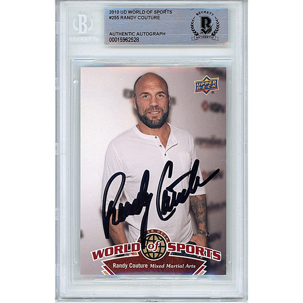 Obtain an exclusive 2010 Upper Deck World of Sports trading card showcasing the autograph of legendary MMA fighter, Randy Couture. Authenticated by Beckett Authentication Services with certification number 00015962528, Couture's hard ink signature is featured on the encapsulated and graded card by Beckett Grading Services. This is a highly sought-after item for MMA enthusiasts and sports memorabilia collectors, crafted from top-quality card stock and originating from the Xtreme Couture team. Secure your own piece of history with the autographed 2010 Upper Deck World of Sports UFC Trading Card #255, signed in Black Sharpie and authenticated and encapsulated by experts at Beckett Authentication Services with certification number 00015962528.