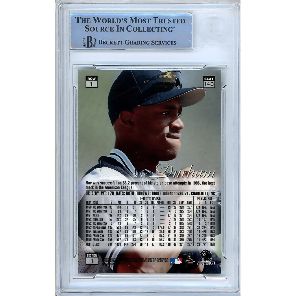 This Ray Durham autographed 1997 Flair Showcase baseball card offers a rare chance to own a piece of baseball history. The card, featuring an on-card autograph from Chicago White Sox player Ray Durham, is authenticated and encased by Beckett Authentication Services (BAS) with certificate number 00016506464. Made from card stock material and an officially licensed trading card, this standard-sized collectible is a valuable addition to any serious collector's collection.
