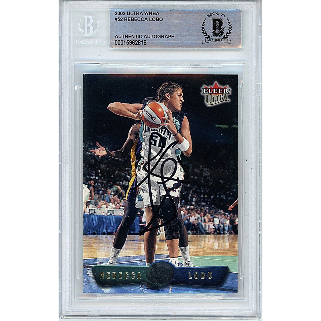 This Rebecca Lobo New York Liberty autographed 2002 WNBA Ultra Basketball Card features a genuine hard-signed signature and is a coveted part of the base set. Authenticated by Beckett Authentication Services (BAS), it is a valuable addition for collectors and fans alike. Made from high-quality card stock, the vintage card showcases Lobo in her NY Liberty uniform. Don't miss out on this must-have for any basketball memorabilia collector or fan of the Connecticut Huskies, UConn Huskies, NY Liberty, or the Houston Comets. Autographed in black Sharpie. Rebecca Lobo Autographed 2002 Fleer Ultra WNBA Basketball Card #52. Encapsulated and authenticated by Beckett Authentication Services (BAS). Certificate Number 00015962818.
