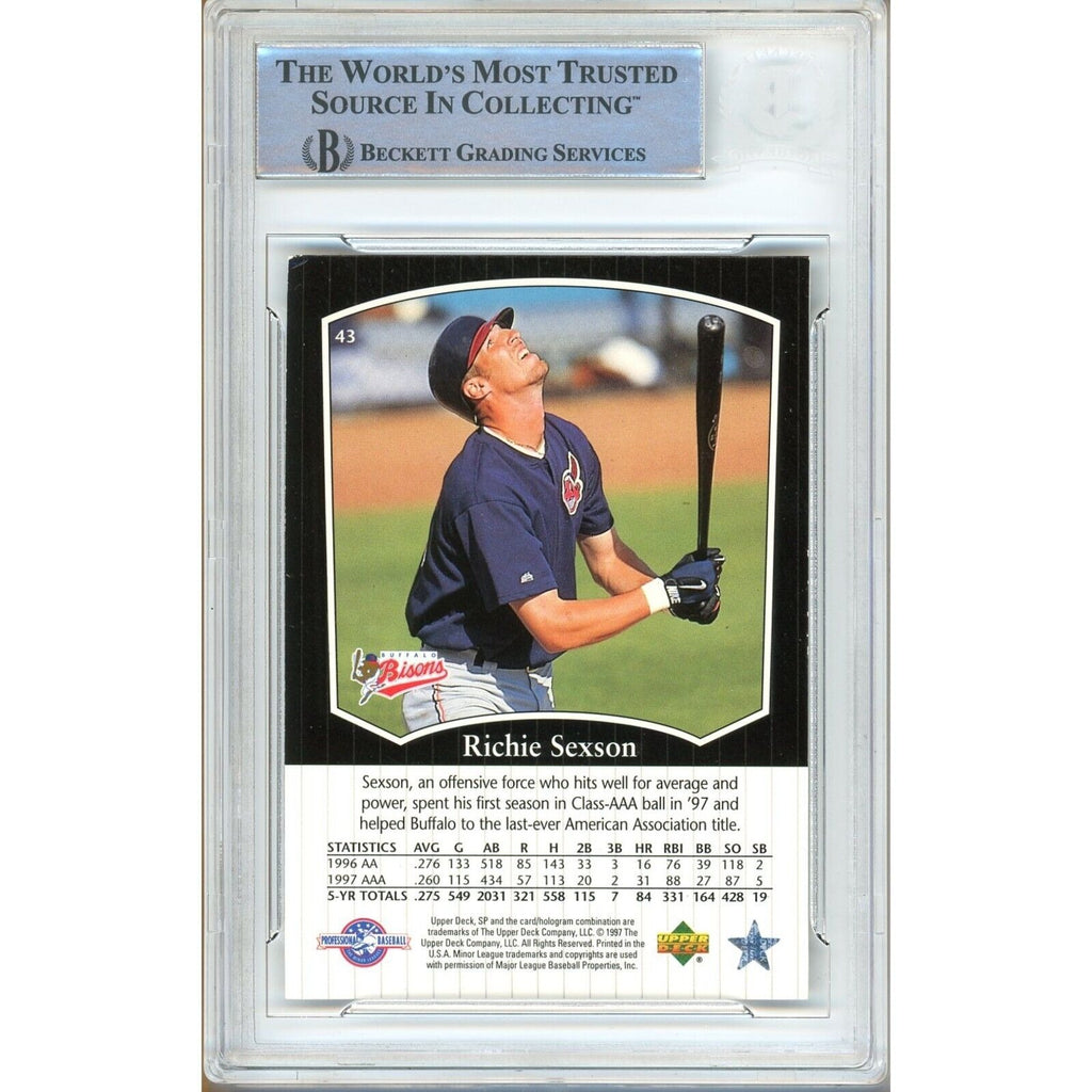 This professionally encapsulated and authenticated 1998 SP Top Prospects baseball card features the autograph of former Major League Baseball player Richie Sexson, who played for the Cleveland Indians (Guardians), Seattle Mariners, and Milwaukee Brewers. Made from high-quality card stock, this vintage card is numbered 43 and is a must-have for experienced collectors looking to add a unique piece to their collection. This autographed card, in black sharpie, bears the seal of authenticity from Beckett Authentication Services (BAS) and comes with Certificate Number 00016502933. A prized addition to any sports trading card collection, especially for fans of Richie Sexson and the Cleveland Indians.