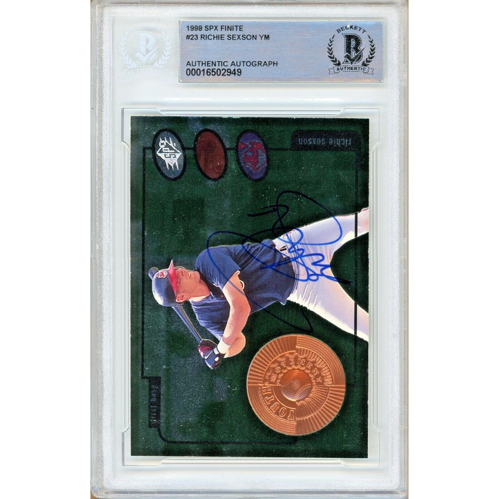 This autographed sports trading card showcases Richie Sexson, a former MLB All Star player for the Cleveland Indians, Seattle Mariners, and Milwaukee Brewers. The card, part of the 1998 SPx Finite Youth Movement set, features a bold blue autograph from Sexson and is encapsulated with a BAS authentication number of 00016502949. A must-have for baseball enthusiasts, this card is officially authenticated and encapsulated by BAS, with a certificate number of 00016502949.