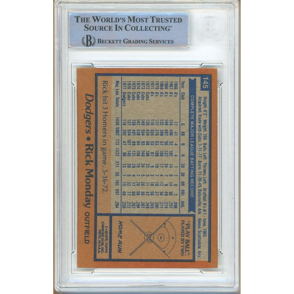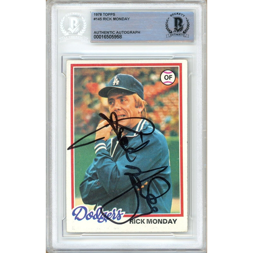 This autographed 1978 Topps baseball card features Rick Monday, a former Major League Baseball player known for his time with the Oakland Athletics, Chicago Cubs, and Los Angeles Dodgers. Encapsulated and authenticated by Beckett Authentication Services (BAS), this card is numbered 145 and is a vintage piece from the 1978 season. It bears a hard-signed autograph by Rick Monday himself, adding value to any baseball fan's collection. Made of high-quality card stock material, it is an original piece and not a licensed reprint. As a must-have trading card for fans of Rick Monday or the Los Angeles Dodgers, it is autographed in black Sharpie and authenticated and encapsulated by the experts at BAS with certificate number 00016505958.