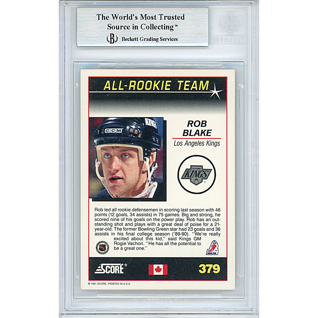 This Rob Blake Autographed Hockey Card commemorates his time with the Los Angeles Kings during the 1991-92 season, as part of the Canadian English All-Rookie Team. The signature, signed in blue sharpie, has been authenticated by experts at Beckett Authentication Services (BAS) and is encapsulated in a tamper-proof BGS card protector. Verify its authenticity at www.Beckett-Authentication.com with the unique authentication number 00013248075. Click on the images for a closer look and browse our website for more autographed collectibles from the NHL and Hockey. Notable Career Accomplishments: 2-Time Stanley Cup Champion, 8-Time NHL All Star Game Selection (1994, 1997, 1999, 2000, 2001, 2002, 2003, 2004), and 2002 Winter Olympics Gold Medalist with Team Canada. 1988 NHL Draft Pick (#70 Overall).