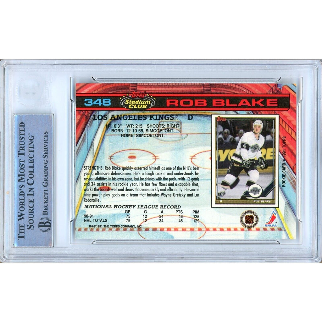This 1991-92 Topps Stadium Club hockey card is a rare and valuable item, autographed by former LA Kings player and NHL legend Rob Blake. Made with high-quality card stock and accompanied by an encapsulation slab from Beckett Authentication Services (BAS) with authentication number 00016509372, this card is a must-have for any hockey card collector or Los Angeles Kings fan. Featuring an on-card autograph from Blake, this vintage piece from the 1991-92 season has a card number of 348. The autograph authentication is from Beckett, making it a trusted addition to any sports memorabilia collection. Signed in Blue Sharpie. Rob Blake Autographed Los Angeles Kings 1991-1992 Topps Stadium Club Hockey Card #348. Expertly authenticated and Encapsulated by Beckett Authentication Services (BAS). Certificate Number 00016509372.