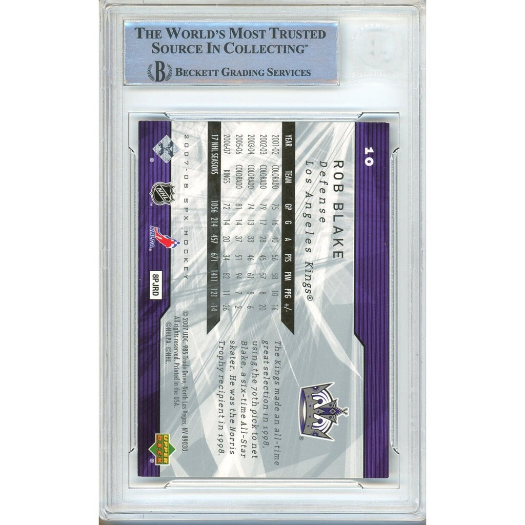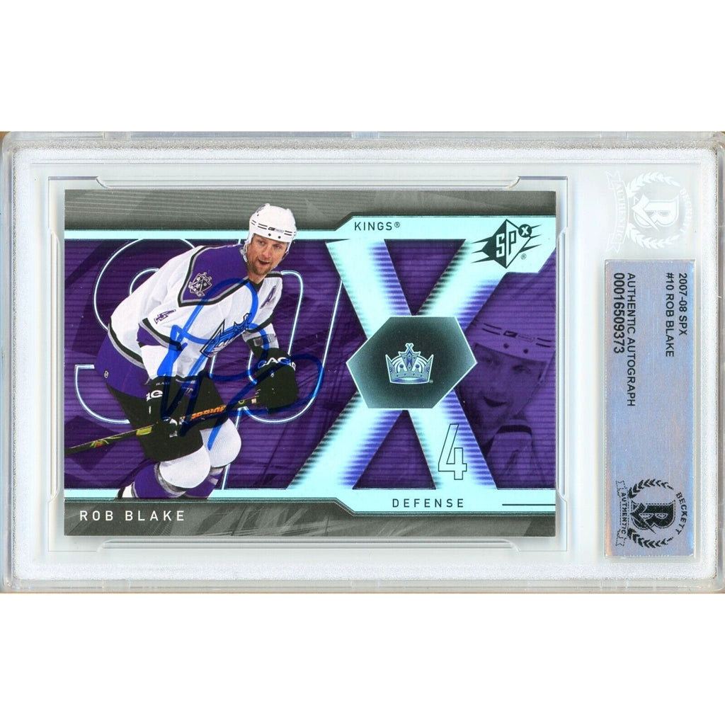 This 2007-08 Upper Deck SPx hockey card is autographed by the legendary Rob Blake, with his signature clearly shown in durable ink. It has been encapsulated and slabbed by Beckett Authentication Services (BAS) for ultimate protection and assurance of authenticity. The card is an original from the National Hockey League (NHL) season of 2007-08, with the number 10 and Upper Deck as the manufacturer. It has a standard size and is an ideal addition for fans of the Los Angeles Kings, San Jose Sharks, or Colorado Avalanche. Perfect for collectors or fans who want to honor their favorite athlete, this sports trading card is in excellent condition and a must-have for any sports memorabilia collection. The signature was signed in Blue Sharpie and has been authenticated and encapsulated by experts at Beckett Authentication Services (BAS). Certificate Number 00016509373.