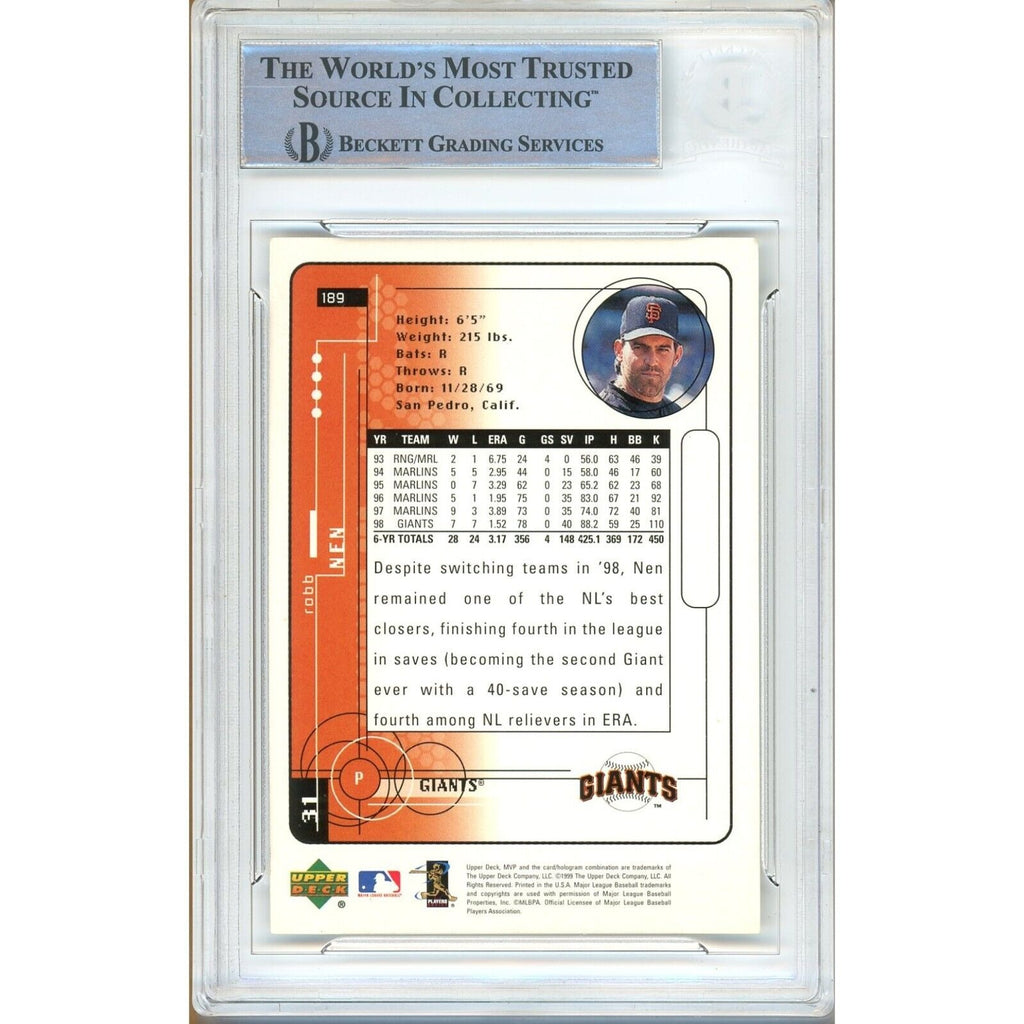 This baseball card is a valuable addition to any sports memorabilia collection, featuring an autographed hard signature of former San Francisco Giants player Robb Nen. Part of the 1999 Upper Deck MVP set, this card has been authenticated by Beckett Authentication Services (BAS) with the authentication number 00016507618. Encapsulated in a BAS Autograph Slab design, it also boasts an on-card autograph and is a vintage item from the era of Major League Baseball (MLB). Officially licensed and manufactured by Upper Deck, this card, numbered 189, is a must-have for any fan of the SF Giants or baseball in general. Autographed in Blue Sharpie. San Francisco Giants 1999 Upper Deck MVP Baseball Card #189, autographed by Robb Nen and authenticated and encapsulated by the experts at Beckett Authentication Services (BAS). Certificate Number 00016507618.