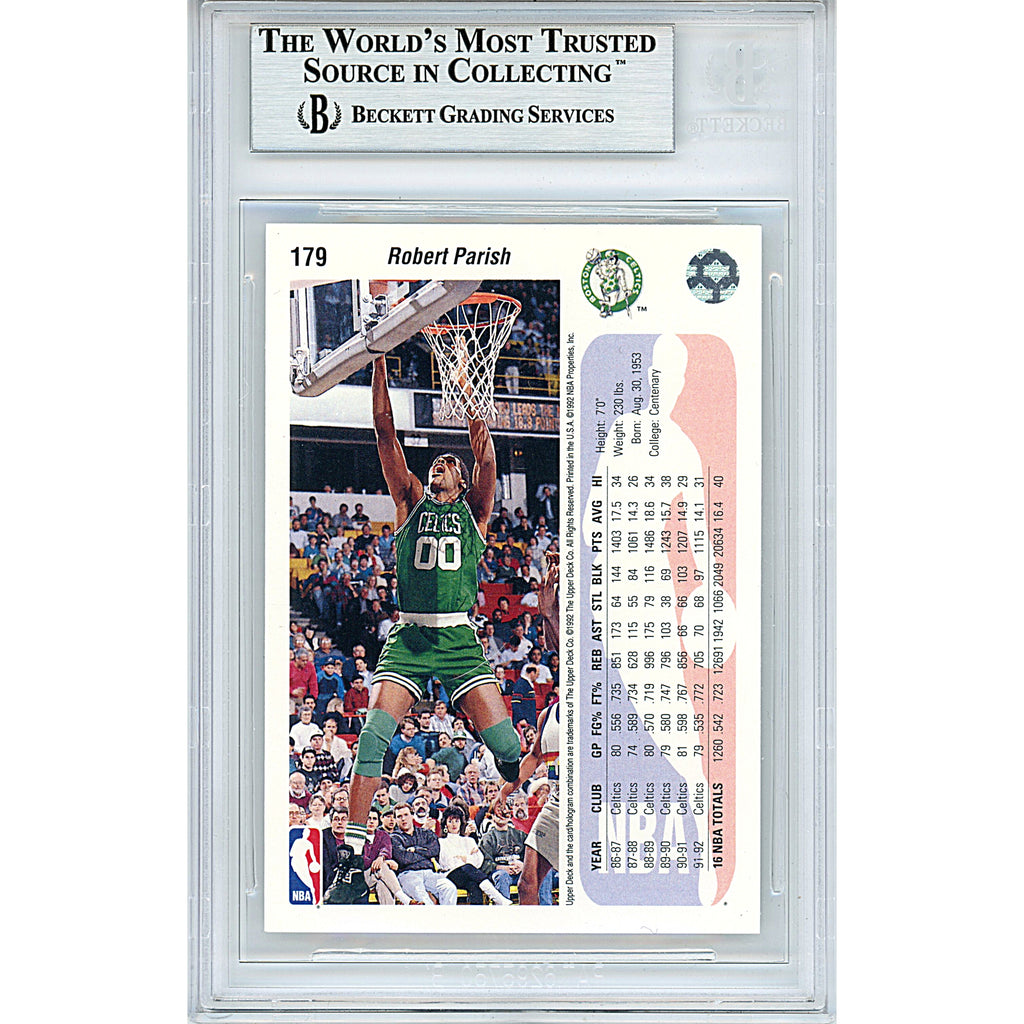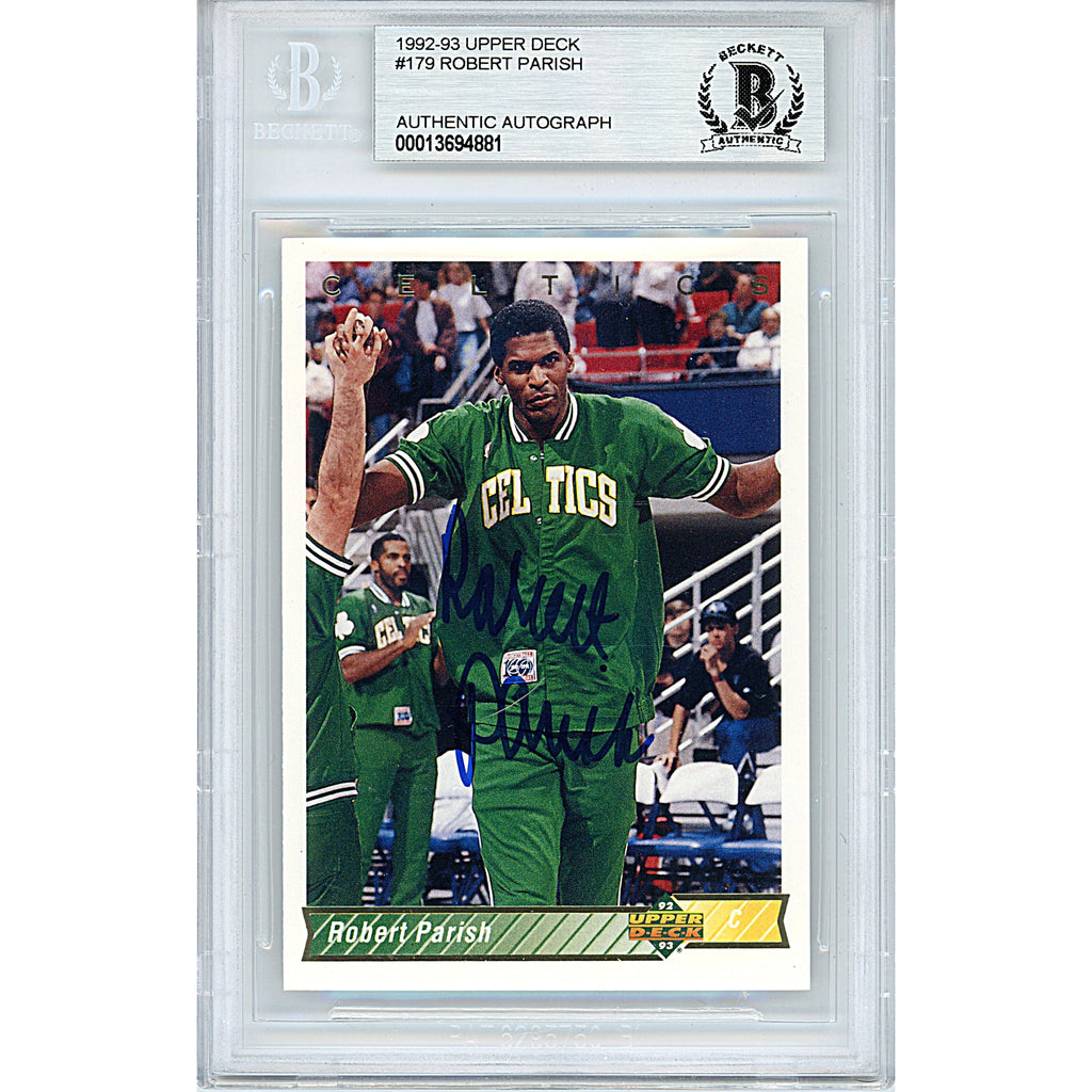 This Robert Parish autographed 'Boston Celtics' 1992-1993 Upper Deck basketball trading card #179 bears a blue sharpie autograph. The signature has been examined and certified authentic by an expert from Beckett Authentication Services (BAS) and is encapsulated in a BGS tamper proof card protector. You can verify its legitimacy by entering the authentication number 00013694881 on www.Beckett-Authentication.com. Please click on the images to enlarge and check out our website for more NBA and basketball autographed collectibles. Some of Parish's most notable career achievements include being inducted into the 2003 Naismith National Basketball Hall of Fame, winning four NBA championships, and being a 9-time NBA All Star selection. He was also named to the NBA 50th and 75th Anniversary Teams and had his jersey #00 retired by the Boston Celtics. On top of that, Parish was the 8th overall pick in the 1976 NBA draft.