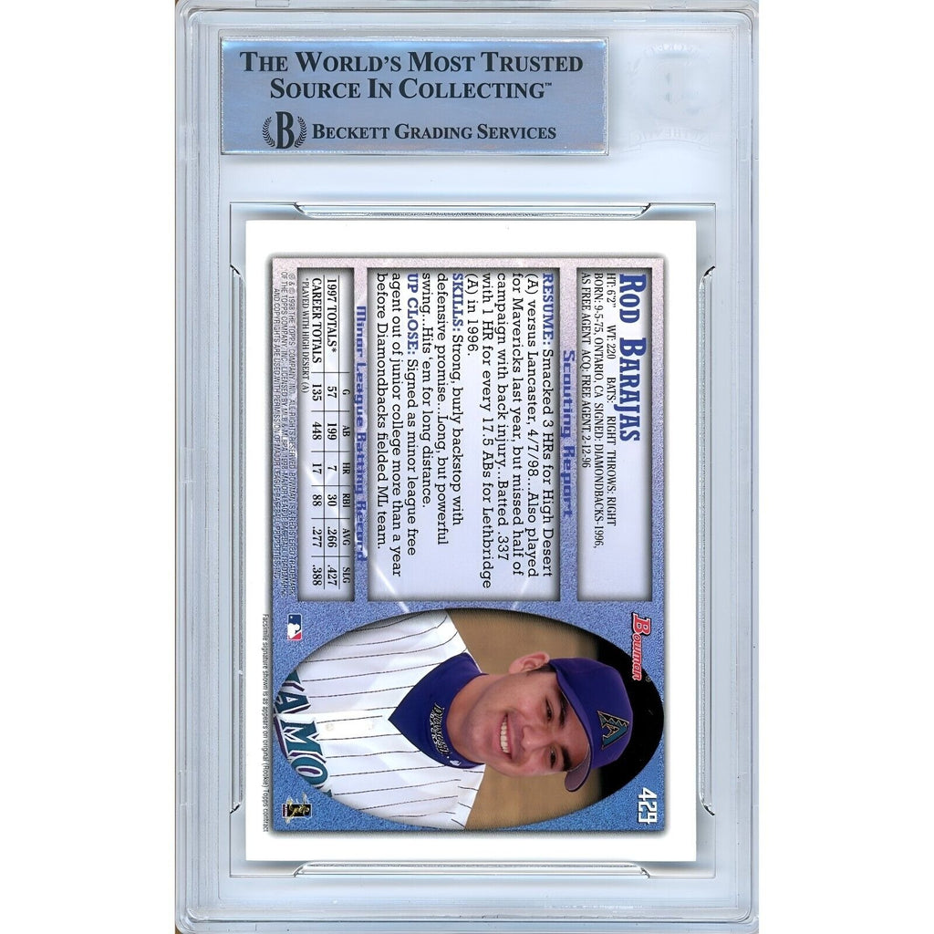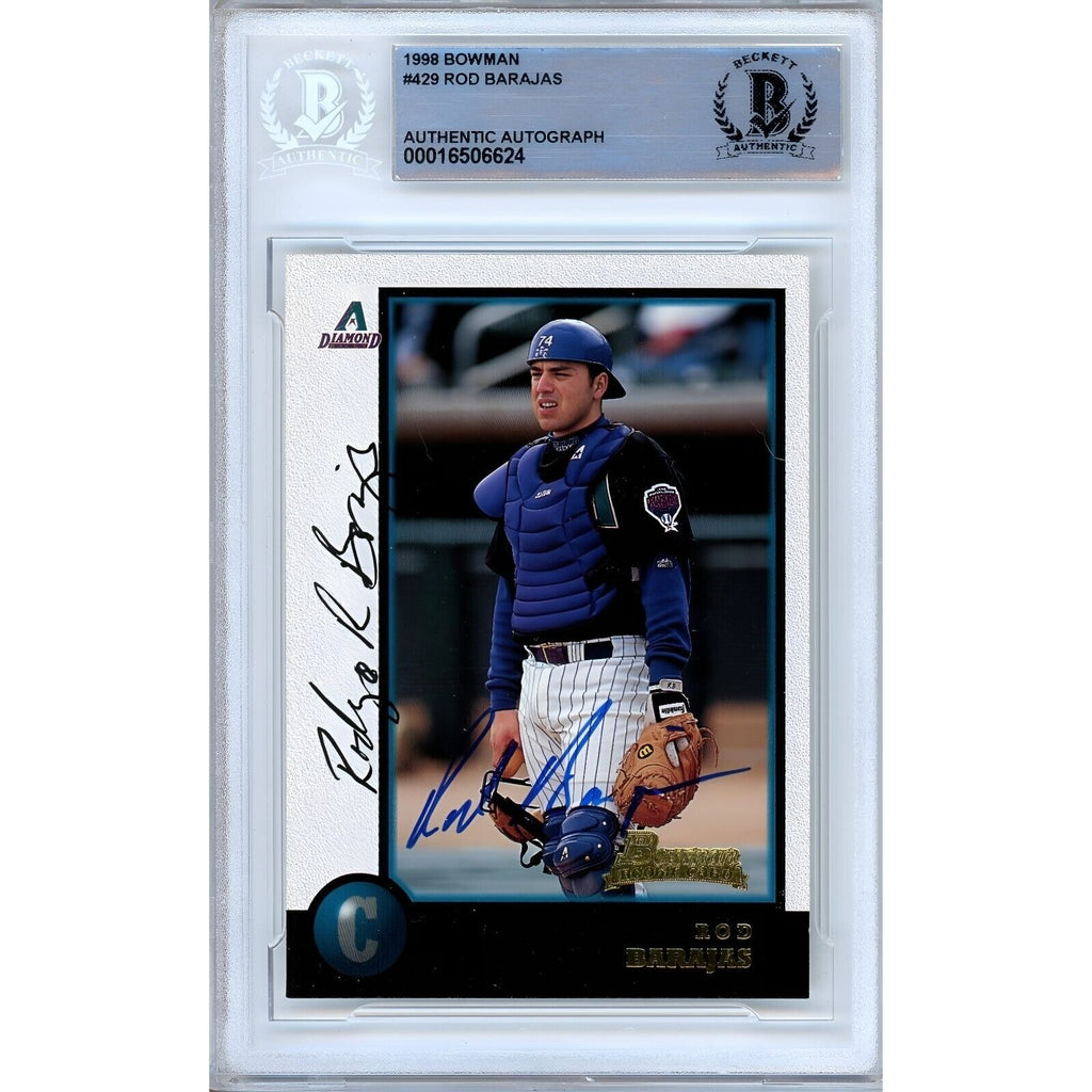 Get your hands on this 1998 Bowman Rookie Card by Rod Barajas of the Arizona Diamondbacks, featuring a signed autograph on a high-quality card stock material and an encapsulated design certified by Beckett Authentication Services (BAS). Whether you are a fan of the Arizona D-Backs, baseball, or collecting, this officially licensed trading card from the 1998 Bowman set is a must-have, adding value to your collection. The autograph, signed in Blue Sharpie by former MLB player Rod Barajas, is authenticated and encapsulated by the experts at BAS with certificate number 00016506624.