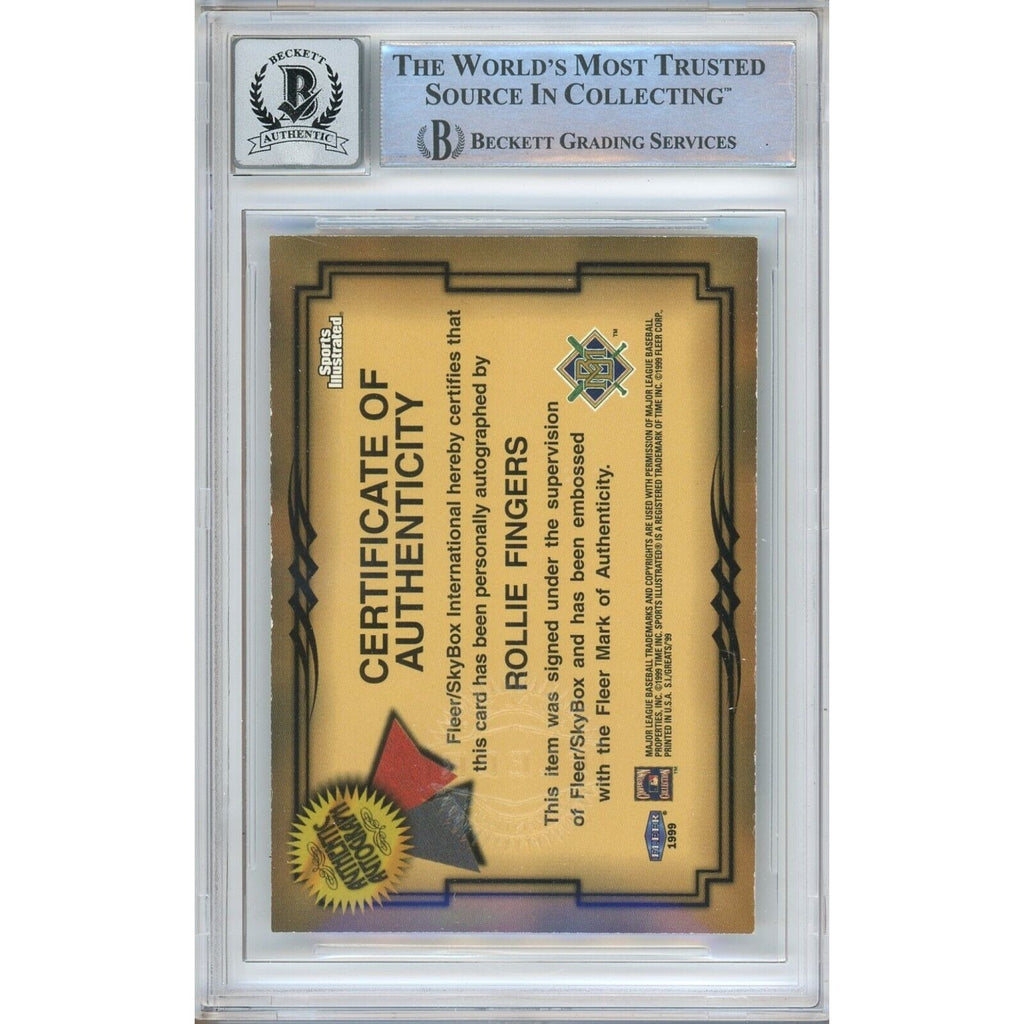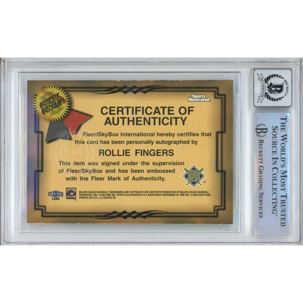 This Rollie Fingers 1999 Sports Illustrated Greats of the Game Autograph Card BGS Auto 10 Graded is a valuable addition to any baseball fan's collection. Hand-signed by the iconic Rollie Fingers and authenticated by Beckett Authentication Services (BAS), this card boasts a detailed and authentic autograph authentication number of 00016501571. Encapsulated in a Beckett slab and in excellent vintage condition, this card is a sought-after gem for collectors. Featuring highlights from Fingers' successful career with the Oakland Athletics and Milwaukee Brewers, this card is a prime choice for any team or player collection. Don't miss your chance to own this autographed sports trading card, signed in Black Sharpie and certified by Beckett Authentication Services (BAS) with the certificate number 00016501571. Additionally, the signature has been graded by Beckett Grading Services (BGS) with a 'Auto 10' grade.