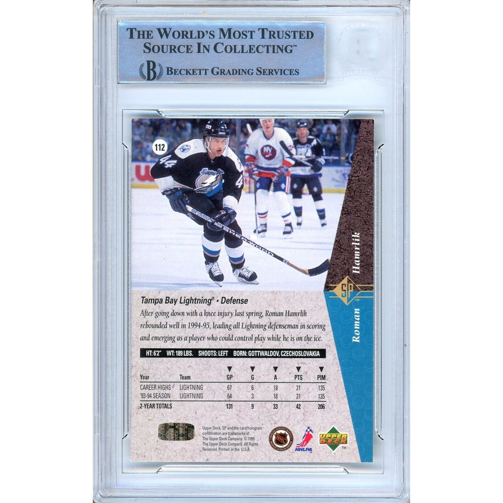 This 1994-95 Upper Deck SP Hockey Card, autographed by Roman Hamrlik of the Tampa Bay Lightning, is a true collectible. Made of durable card stock and officially licensed, this card is authenticated by Beckett Authentication Services (BAS) with a certificate number of 00016503257. With an on-card autograph, this short-printed card is a one-of-a-kind piece of Tampa Bay Lightning memorabilia. NHL fans and collectors alike will appreciate this autographed card, which comes signed in blue Sharpie and is encapsulated and certified by BAS with certificate number 00016503257.