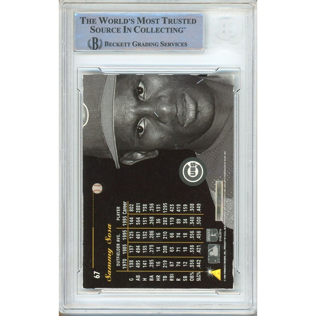 This 1996 Pinnacle Aficionado trading card features a hard-signed autograph from baseball legend Sammy Sosa of the Chicago Cubs. The card is authenticated and encapsulated by Beckett Authentication Services (BAS), with an authentication number of 00016502851. It is a standard-sized card made of card stock and is an officially licensed trading card. The autograph card is numbered 67 in the set. This card is a valuable addition to any collection of Chicago Cubs memorabilia and is an excellent sports trading card for fans of Sammy Sosa or the Chicago Cubs. The autograph is in blue Sharpie and has been verified and encapsulated by the experts at Beckett Authentication Services (BAS). Certificate Number 00016502851.