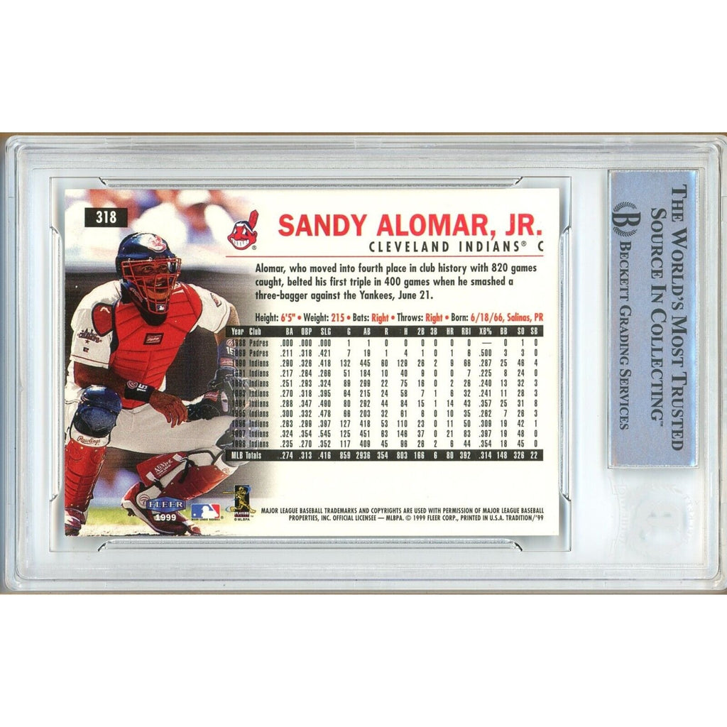 This autographed baseball card of Sandy Alomar Jr is a must-have for collectors. It features an on-card autograph from the former Cleveland Indians (Guardians) player, along with a Beckett slab and authentication number 00016506634. Part of the 1999 Fleer Tradition set with a card number of 318, this card is made of card stock and is an original. It will be a valuable addition to any collection, especially for fans of the Cleveland Indians, baseball, and sports trading cards. Secure your piece of history today with this Black Sharpie autograph. Sandy Alomar Jr. Autographed Cleveland Indians 1999 Fleer Tradition Baseball Card #318, authenticated and Encapsulated by Beckett Authentication Services (BAS). Certificate Number 00016506634.