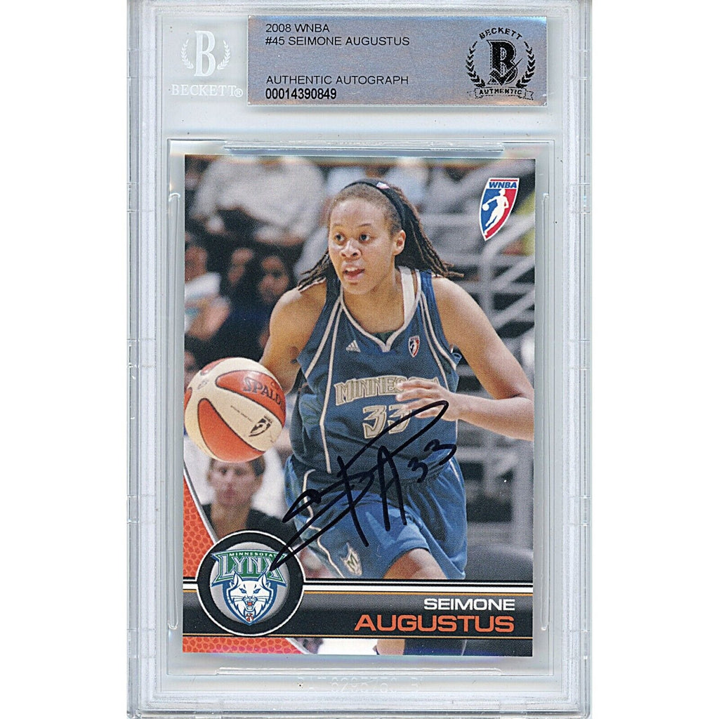 Add this authentic Seimone Augustus Minnesota Lynx 2008 WNBA autographed card to your collection today. The card, featuring a hard-signed autograph by Augustus with authentication number 00014390849, has been slabbed and encapsulated in excellent condition by Beckett Authentication Services (BAS). Made with high-quality card stock, the card showcases Augustus in her Minnesota Lynx uniform and is a part of the base set from the 2008 WNBA season. Don't miss this chance to own this original card with a clear and sharp autograph. Seimone Augustus Autographed Minnesota Lynx 2008 WNBA Basketball Card #45 in Black Sharpie, authenticated and encapsulated by BAS with Certificate Number 00014390849.