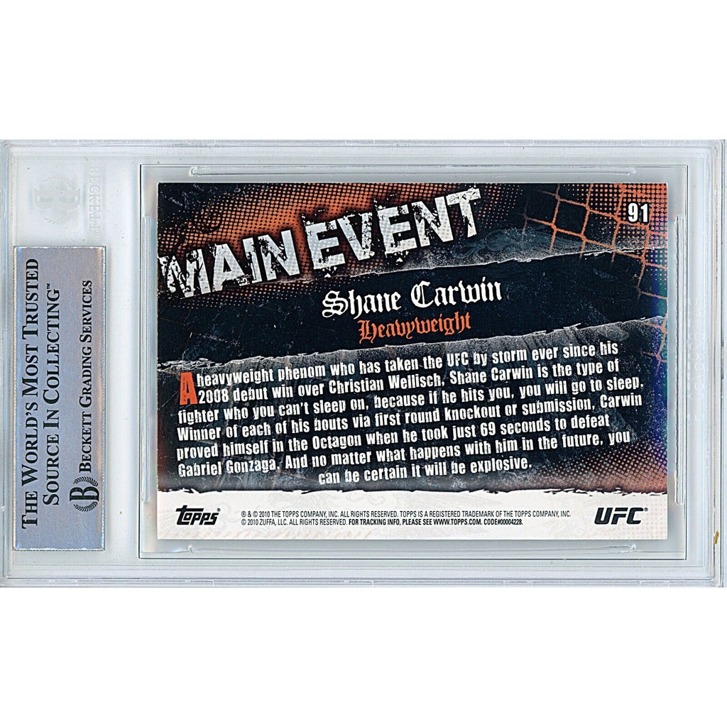 This 2010 Topps UFC Main Event signed trading card, featuring the autograph of former UFC heavyweight fighter Shane Carwin, is authenticated by Beckett Authentication Services (BAS) and comes in a protective slab. It is a standard size card with the number 91 and is part of the Main Event parallel/variety set. Made with high-quality card stock, the card is in excellent condition and a unique addition to any UFC or MMA fan's collection. The autograph, done in black Sharpie, has been authenticated and encapsulated by the experts at Beckett Authentication Services (BAS). Certificate Number 00014874438.