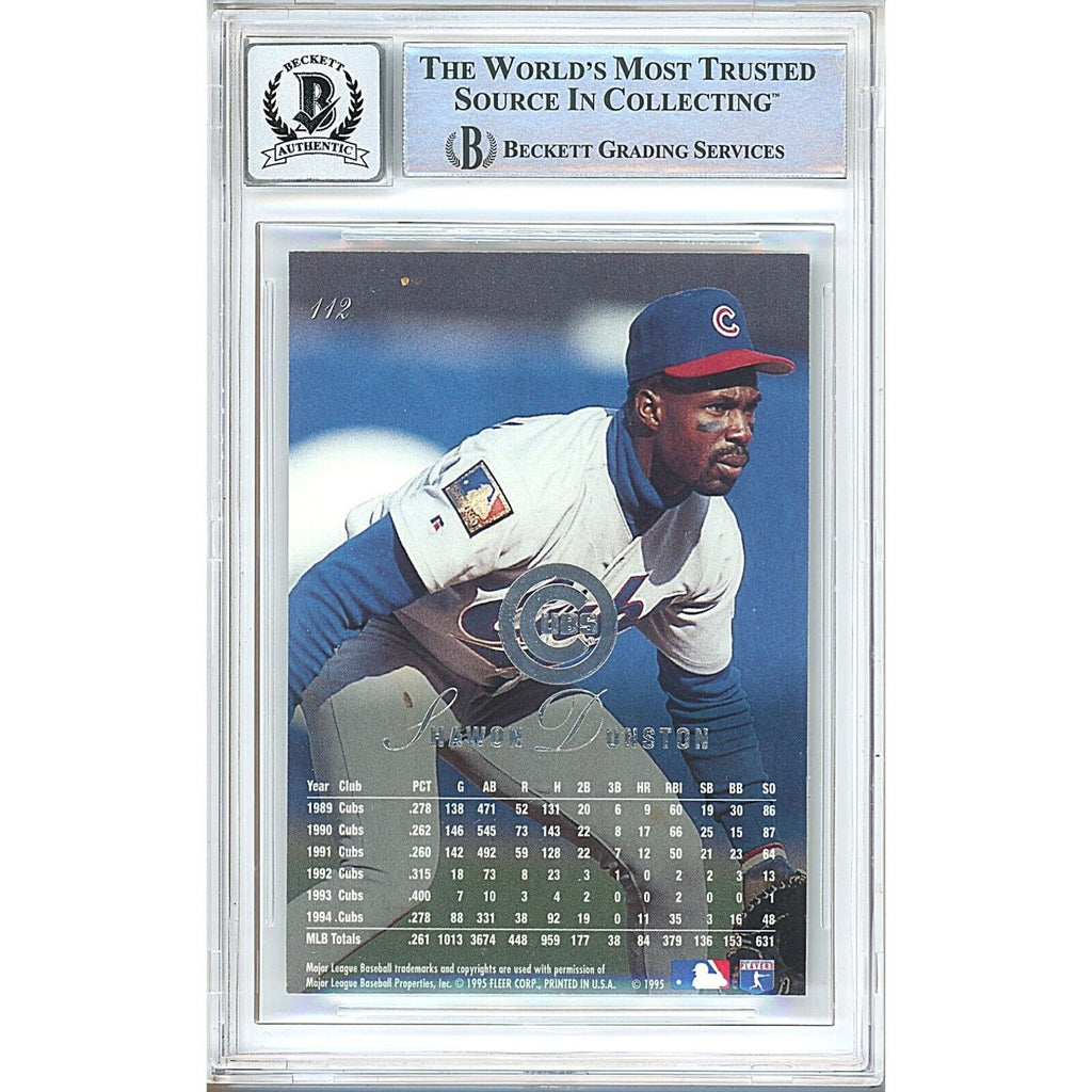 This autographed 1995 Shawon Dunston Cubs baseball card is a must-have for any fan, featuring a hard-signed autograph from the former player, verified by Beckett Authentication Services (BAS) with a grade of 10. Encased in a Beckett slab, the card is in excellent condition and includes the Chicago Cubs logo and 112 set number. Made of cardstock, this original licensed card from the 1995 Flair set is a standard size perfect for any sports trading card collection. Own a piece of baseball history today with this unique autographed piece! Signature in Blue Sharpie. Shawon Dunston Autographed Chicago Cubs 1995 Flair Baseball Card #112. Authenticated and Encapsulated by Beckett Authentication Services (BAS). Certificate Number 00016496182. Experts from Beckett Grading Services (BGS) have graded the signature with an 'Auto 10' rating.