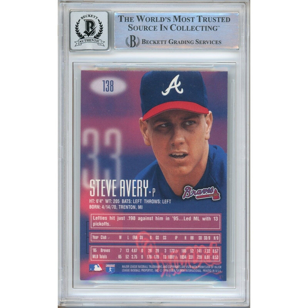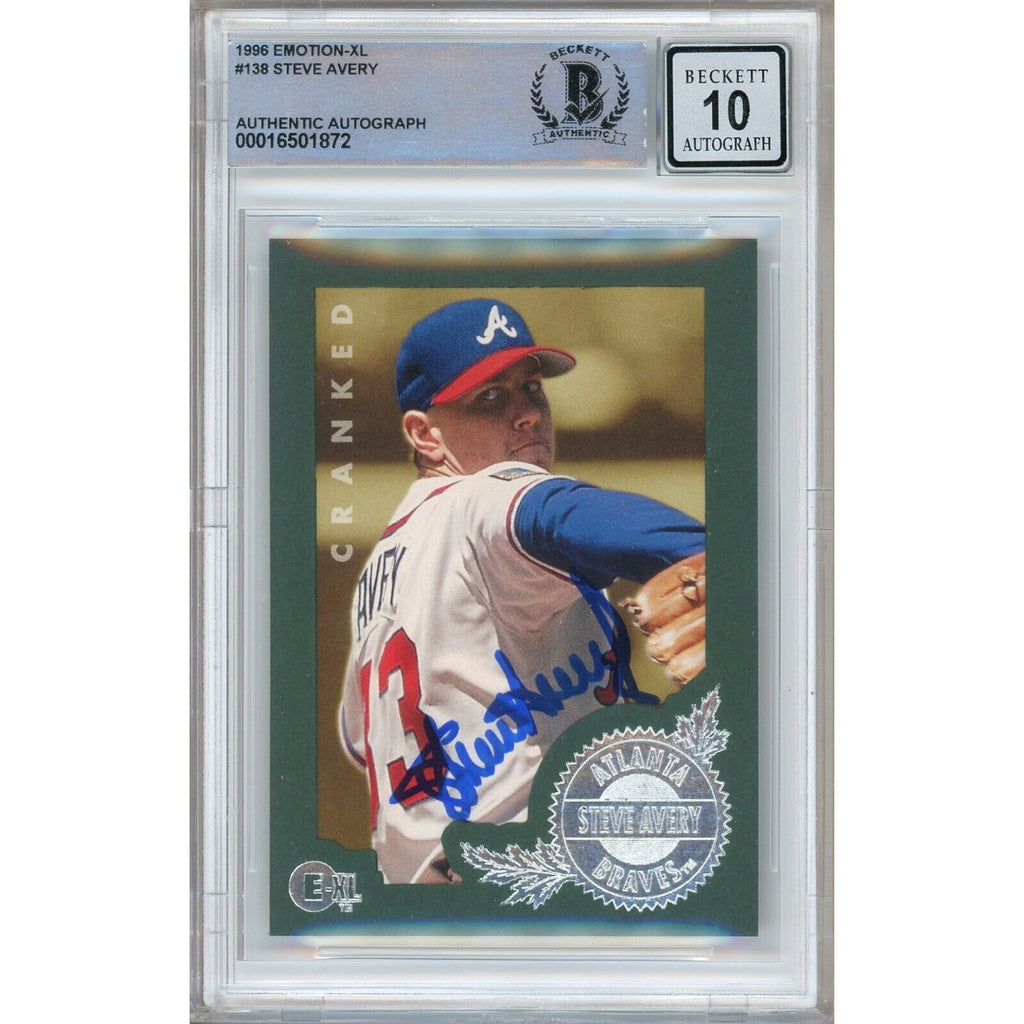 This vintage Steve Avery autographed 1996 Emotion-XL baseball card #138 is a rare collectible featuring the Atlanta Braves pitcher's autograph. The officially licensed, encapsulated card is authenticated by Beckett Authentication Services (BAS) with an autograph grade of Gem Auto-10, making it a must-have addition for any baseball fan. Authenticated by BAS, this card also includes features such as Braves signed, Steve Avery signed, and on-card auto. Add this piece of baseball history, autographed in blue sharpie, to your collection now! Steve Avery Autographed Atlanta Braves 1996 Fleer/Skybox Emotion-XL Baseball Card #138. Encapsulated by Beckett Authentication Services (BAS) with certificate number 00016501872. Graded by Beckett Grading Services (BGS) with an 'Auto 10' grade.