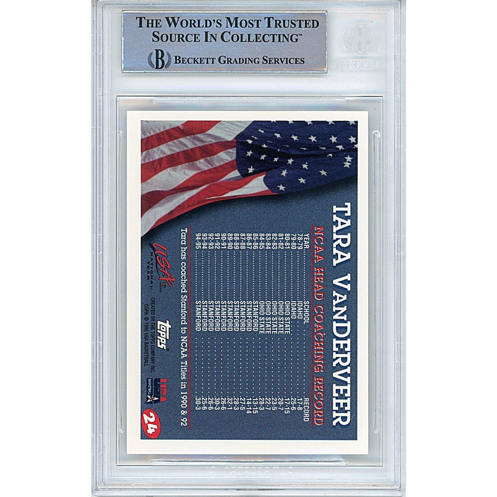This autographed Tara Vanderveer Team USA 1996 Topps Olympics Card is a highly sought-after item for collectors. As a coach for the USA Women's National Team, Vanderveer's autograph holds great value. The signature, carefully signed in black sharpie, comes with an authentication number (00014874012) from Beckett Authentication Services (BAS). The card, made of durable card stock, is encapsulated and slabbed for enhanced protection and verified authenticity. A vintage piece from the 1996 Topps Team USA base set, this card is a valuable addition to any sports trading card collection, particularly for admirers of Stanford University, the Ohio State Buckeyes, or the US Women's National Team. This signature has also been authenticated and encapsulated by the experts at BAS, with certificate number 00014874012.