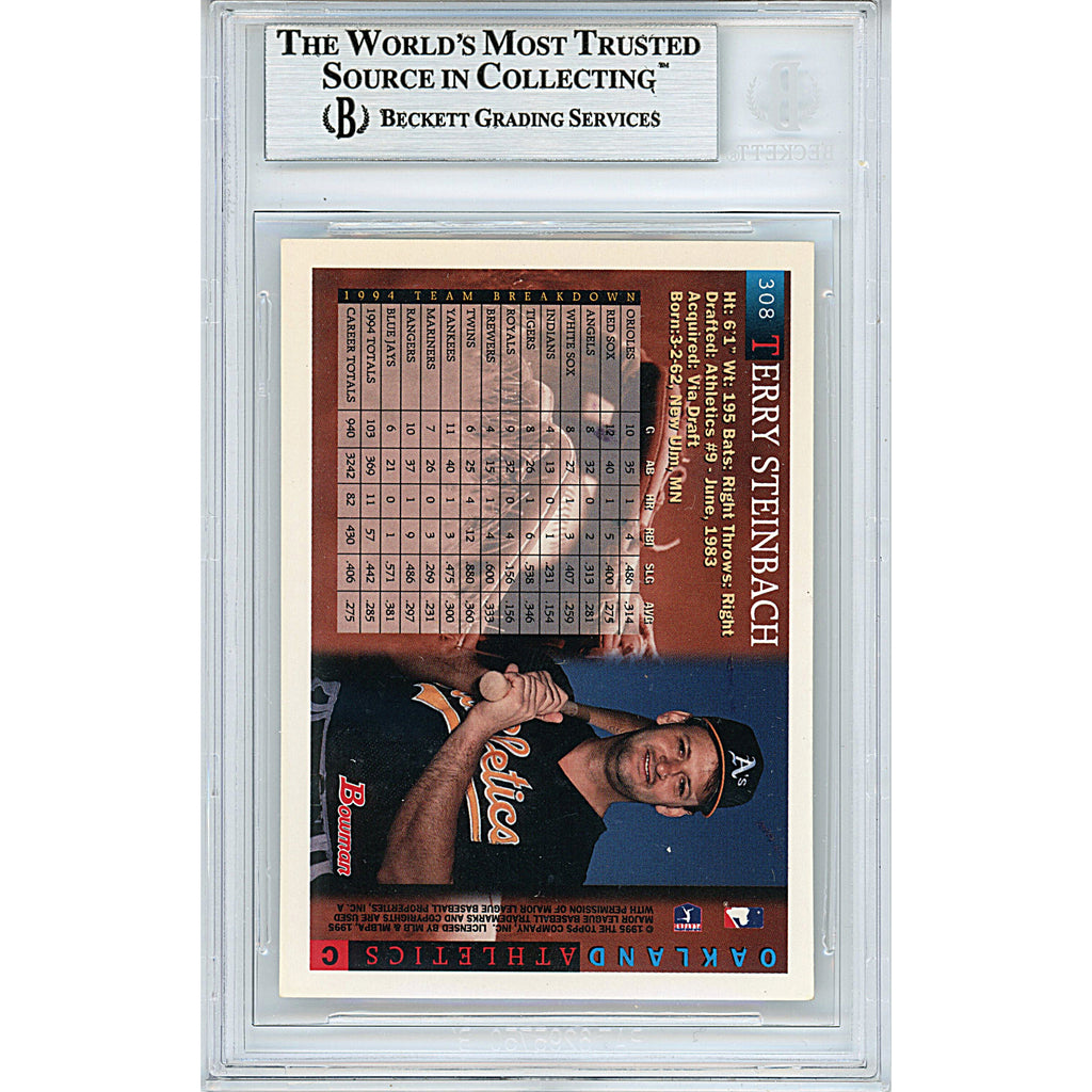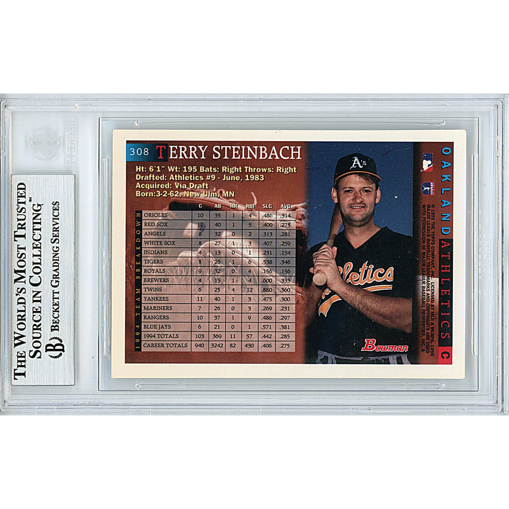 This Terry Steinbach autographed 'Oakland Athletics' 1995 Bowman baseball trading card #308 has been examined and certified as authentic by an expert from Beckett Authentication Services (BAS). The signature is in blue sharpie and the card is encapsulated in a tamper-proof BGS card protector. To verify the authentication, visit www.Beckett-Authentication.com and use the authentication number 00013191138. Please click on images to enlarge. For more MLB and baseball autographed collectibles, browse our website. Notable career accomplishments include being a 3-time MLB All Star game selection and winning the 1989 World Series with the Oakland Athletics.