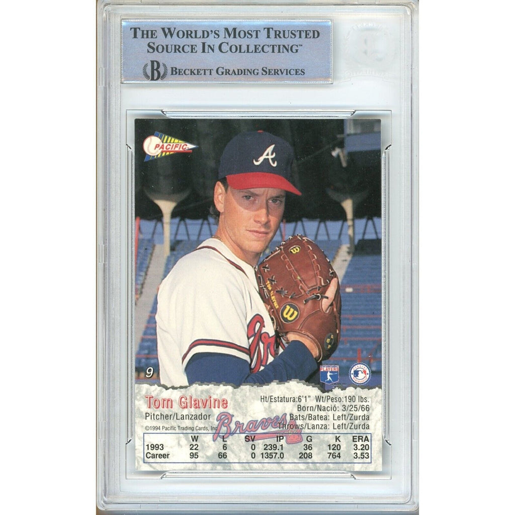 This Tom Glavine Atlanta Braves autographed baseball card from the 1994 Pacific set is a necessity for any devoted collector of baseball cards. The card showcases Glavine's signature in black Sharpie and has been verified and enclosed by Beckett Authentication Services (BAS) with authentication number 00016506831. Made of card stock and in standard size, this card is an original and licensed product of the Pacific manufacturer, making it a valuable addition to any collection. As a vintage card, it is an ideal choice for fans of both the NY Mets and Atlanta Braves. Secure this authenticated Tom Glavine autographed card for your collection today.