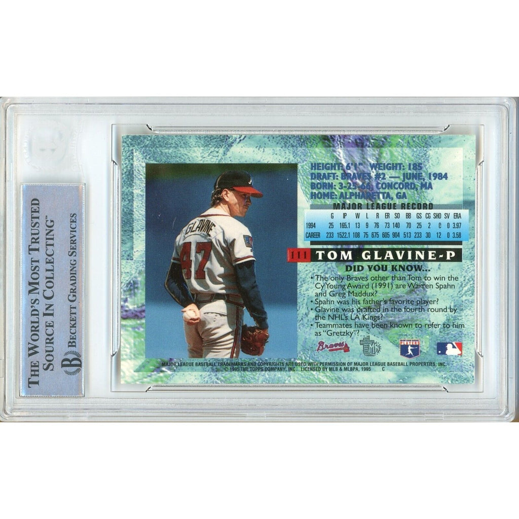 This 1995 Topps Embossed Golden Idols card showcases the hard-signed autograph of Tom Glavine, legendary Atlanta Braves pitcher and Baseball Hall of Famer. It has been authenticated and encapsulated by Beckett Authentication Services (BAS) with authentication number 00016506835. Made in 1995, this vintage card is part of the exclusive Golden Idols insert set. Its sturdy card stock and English language add to its appeal for collectors of sports trading cards. Numbered 111 and officially licensed by Topps, this card is a must-have for fans of the New York Mets or the Atlanta Braves. As a Major League (MLB) card, it holds significant value and is a unique addition to any baseball memorabilia collection. The autograph is in Blue Sharpie and the card has been encapsulated and authenticated by the experts at Beckett Authentication Services (BAS). Certificate number 00016506835.