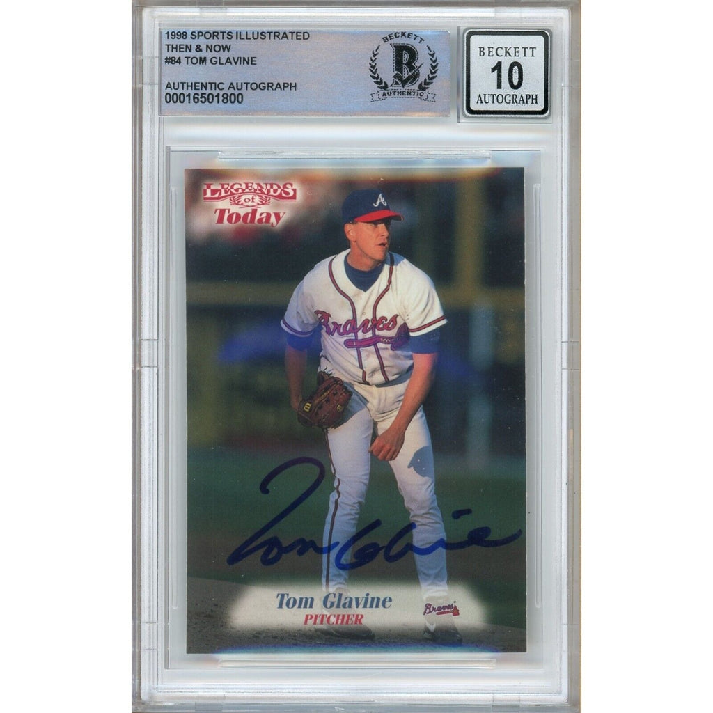 This Tom Glavine autographed 1999 Fleer Sports Illustrated Then and Now baseball card is a must-have for any Atlanta Braves or New York Mets fan. The autograph has been authenticated by Beckett Authentication Services (BAS) with a grade of 10. The card is in excellent condition and features Glavine during his MLB career, making it a valuable addition to any sports card collection. It is an original card made in 1999 in the United States. Don't miss the chance to own a piece of baseball history. Autographed in blue Sharpie. Tom Glavine Signed Atlanta Braves 1999 Fleer Sports Illustrated Baseball Card #84. Authenticated and Encapsulated by Beckett Authentication Services (BAS). Certificate Number 00016501800. Graded by Beckett Grading Services (BGS) with an 'Auto 10' grade.
