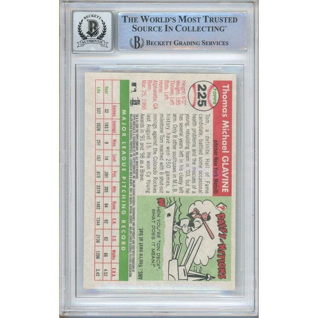 This autographed 2004 Topps Heritage baseball card, signed by New York Mets pitcher and former Atlanta Braves player Tom Glavine, features a autograph grade of 10 from Beckett Authentication Services (BAS). Encapsulated in a Beckett slab and made of card stock, this sports trading card is part of the 2004 Topps Heritage set and bears the number 225. A vintage card with an original licensed design, it showcases a hard-signed, on-card autograph and is in excellent condition. A must-have for fans of the Mets or Braves, this card is a valuable addition to any sports trading card collection. The signature, authenticated and encapsulated by the experts at BAS, has been graded a 'Auto 10' by Beckett Grading Services (BGS). A certificate number of 00016501797 accompanies this signature.