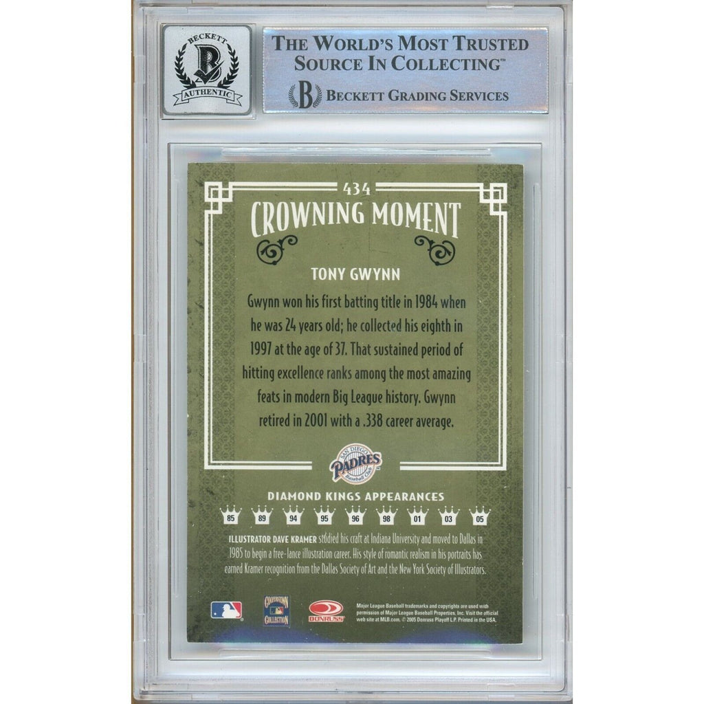 Enhance your San Diego Padres collection with this 2005 Donruss Diamond Kings trading card autographed by Tony Gwynn and authenticated by Beckett Authentication Services (BAS) and Beckett Grading Services (BGS) with a perfect grade of 10. This standard size card features Gwynn in his Padres uniform, numbered 434, and is crafted from durable card stock. Part of the 2005 Donruss Diamond Kings set, this card is a valuable addition to any Major League Baseball (MLB) trading card collection. The autograph is hard-signed and on-card, making it a highly sought-after collectible item. This vintage autographed card is a must-have for any collector, and comes with a blue Sharpie signature that has been authenticated and encapsulated by the experts at Beckett Grading Services (BGS), featuring a 'Auto 10' grade. Certificate Number 00016501582.