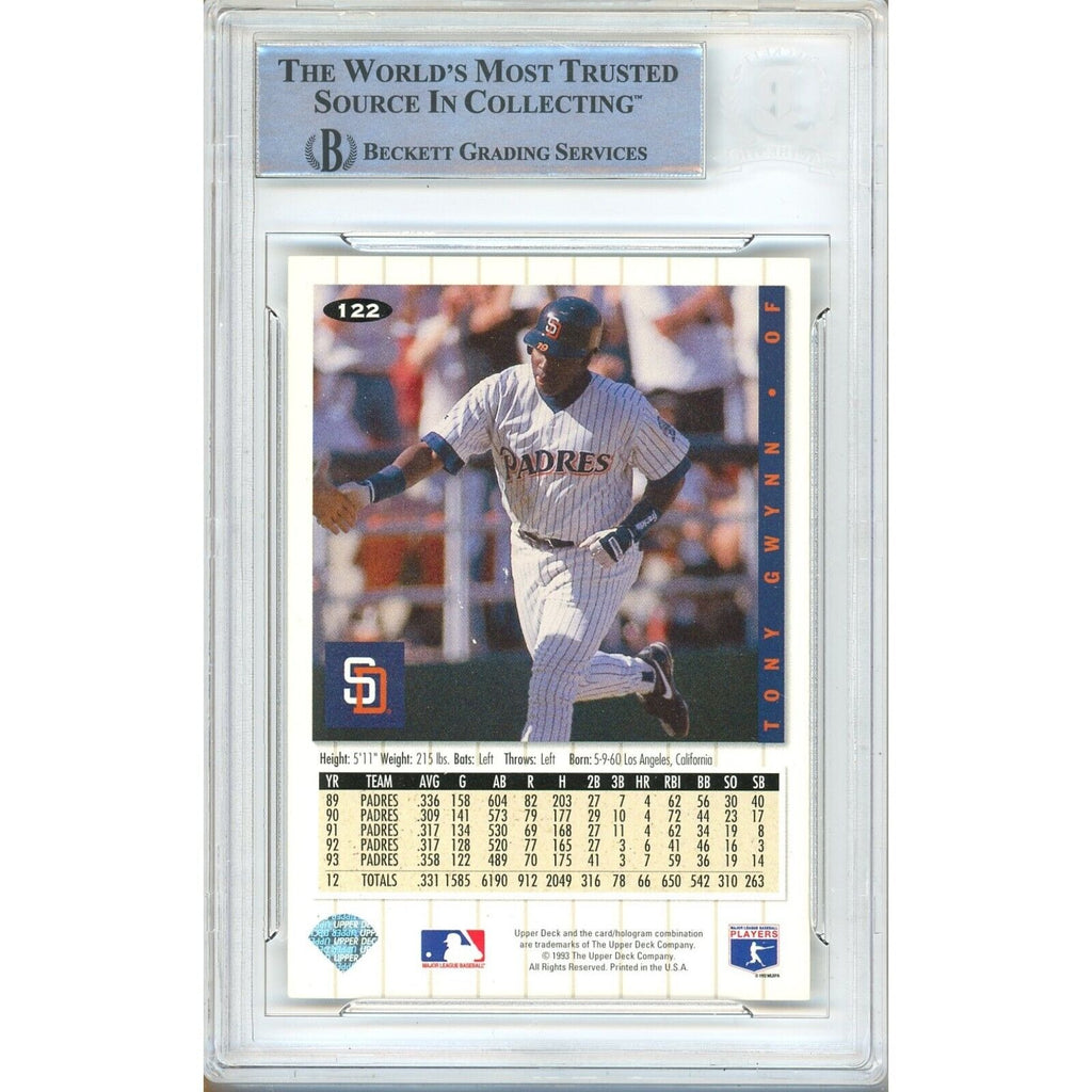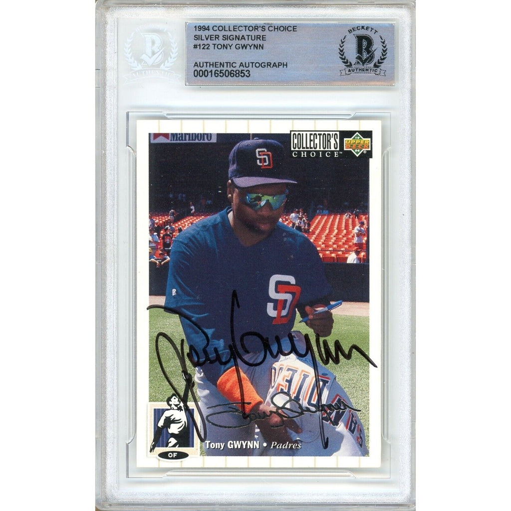 This autographed 1994 Upper Deck Collector's Choice Silver Signature variant card signed by Tony Gwynn, authenticated by Beckett Authentication Services (BAS), is a valuable addition to any fan's baseball collection. The card, in excellent condition, showcases Gwynn's time with the San Diego Padres, where he achieved 15 All-Star selections and 7 National League batting championships. Part of Gwynn's entire career with the Padres, this autographed card is a must-have for fans of the Aztecs, SDSU, and the Padres. Authenticated and encapsulated by Beckett Authentication Services (BAS), this autographed 1994 Upper Deck Collector's Choice card, #122, is a one-of-a-kind find. Certificate Number 00016506853.