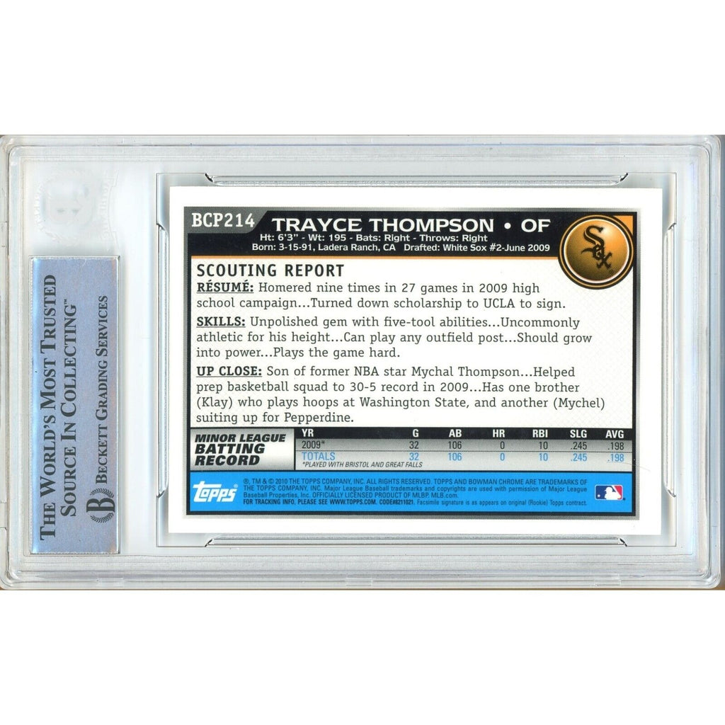 This autographed card of Trayce Thompson, featuring an on-card autograph from the Chicago White Sox and New York Mets outfielder, is a valuable addition to any baseball fan's collection. With its standard size and high-quality card stock material, this card is a true gem. It has been authenticated by Beckett Authentication Services (BAS) with a certification number of 00016508246, making it an officially licensed trading card with the card number BCP214a. Don't wait to add this Beckett-authenticated Trayce Thompson autographed card, signed in Blue Sharpie, to your collection today!